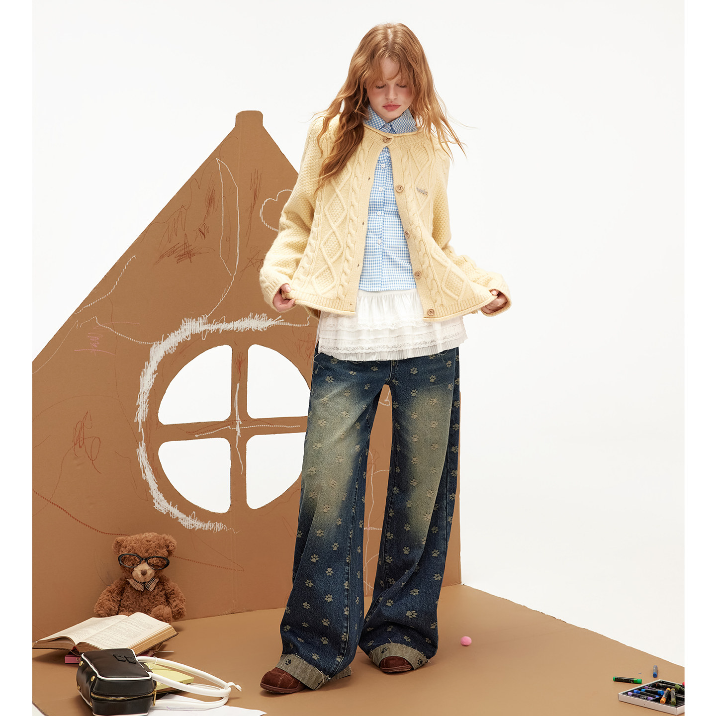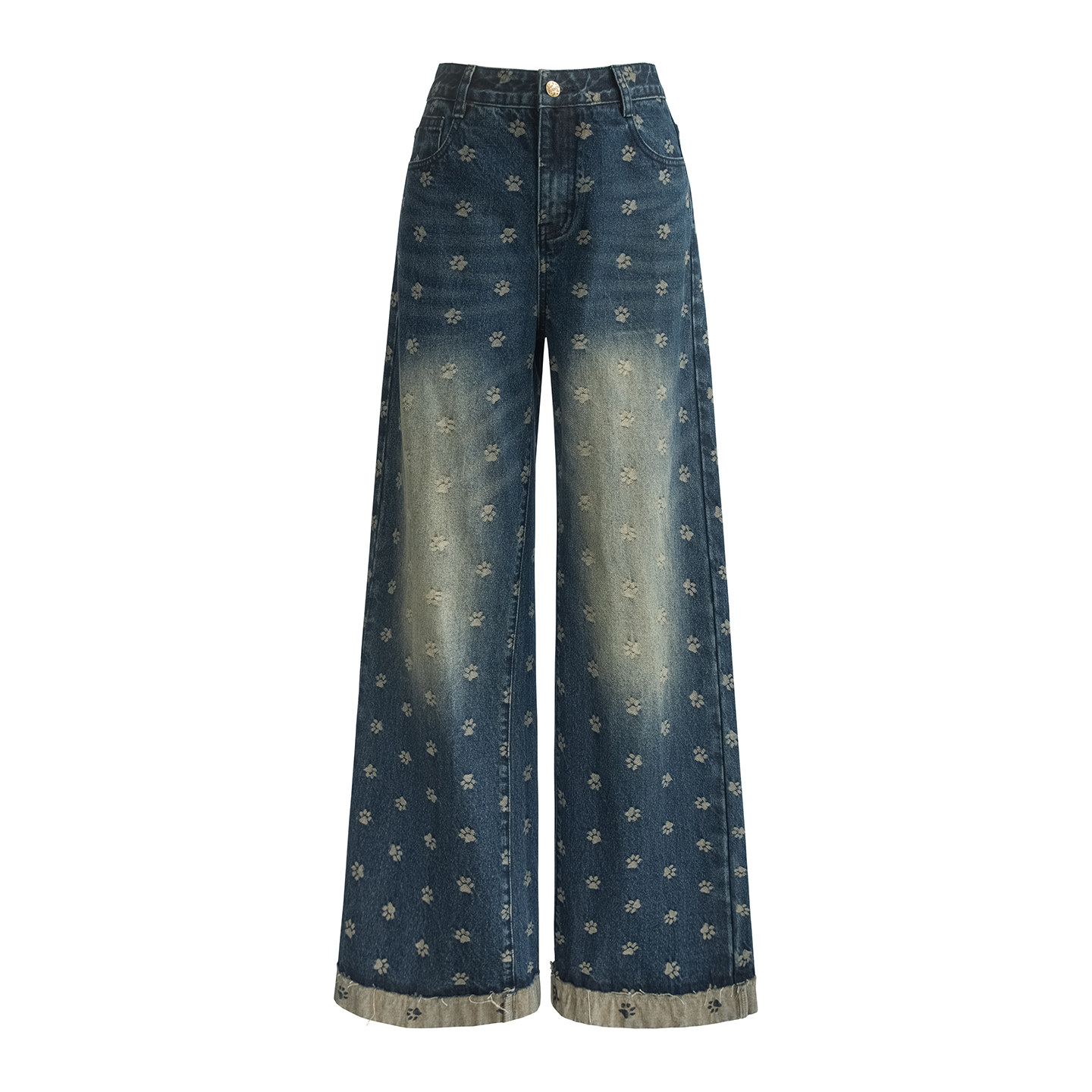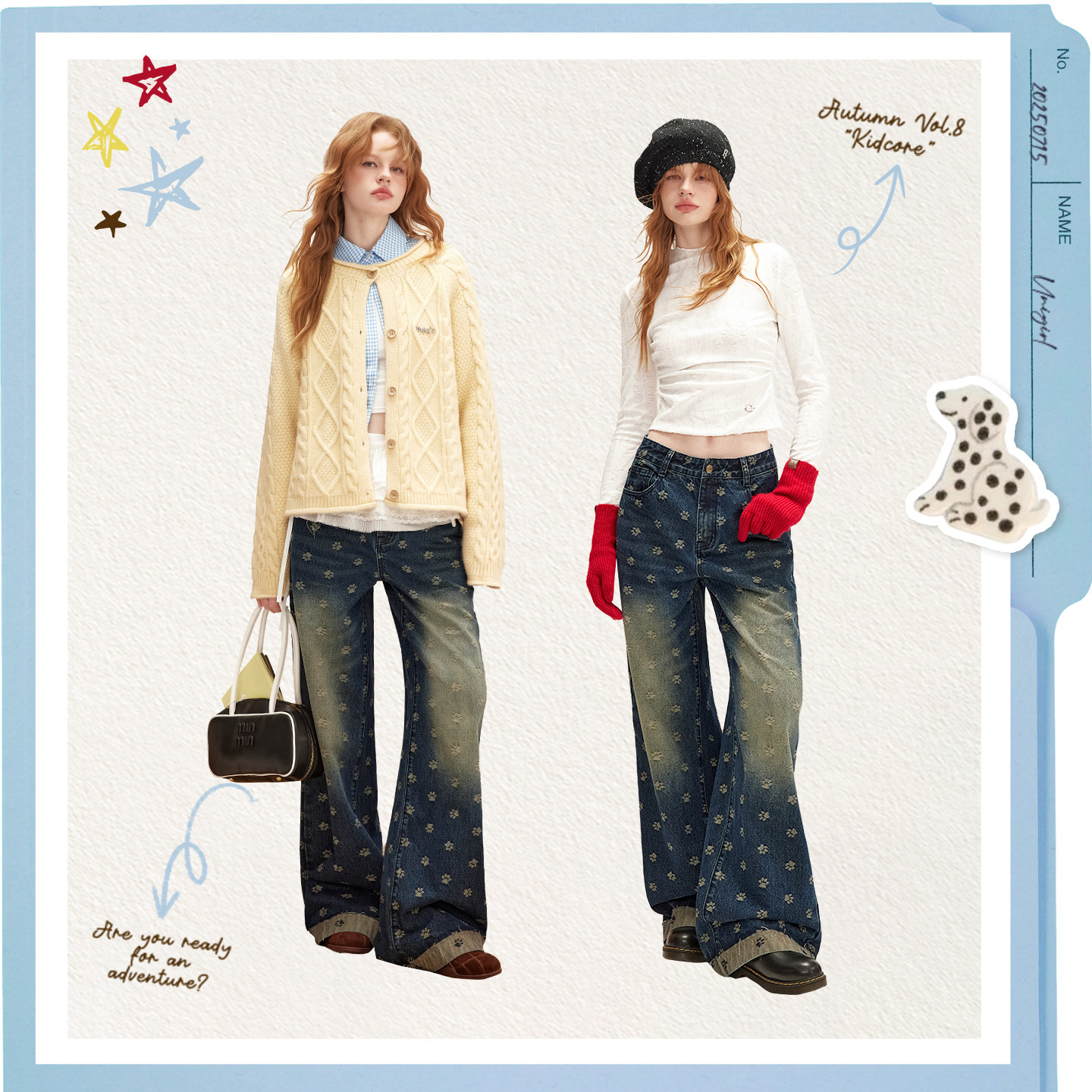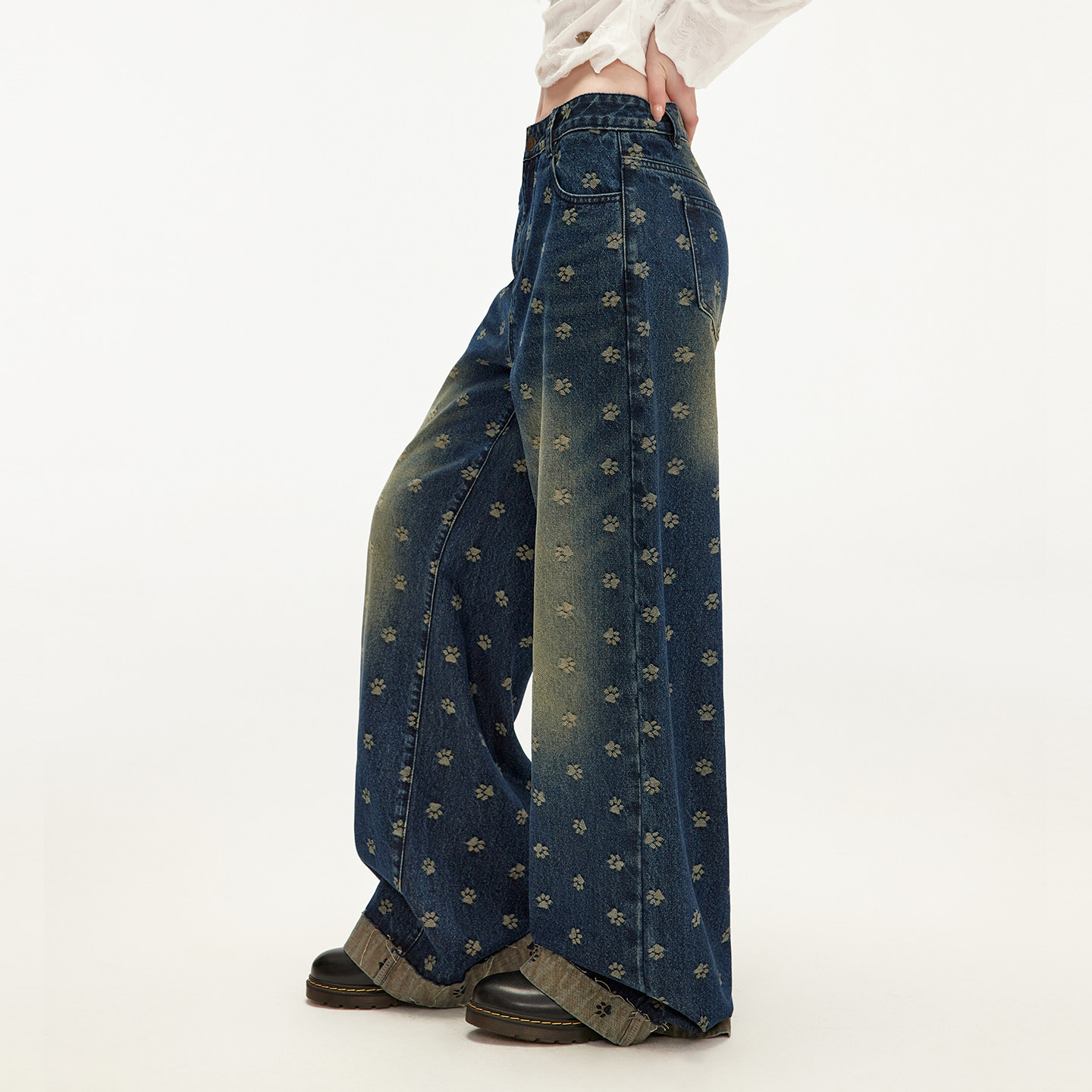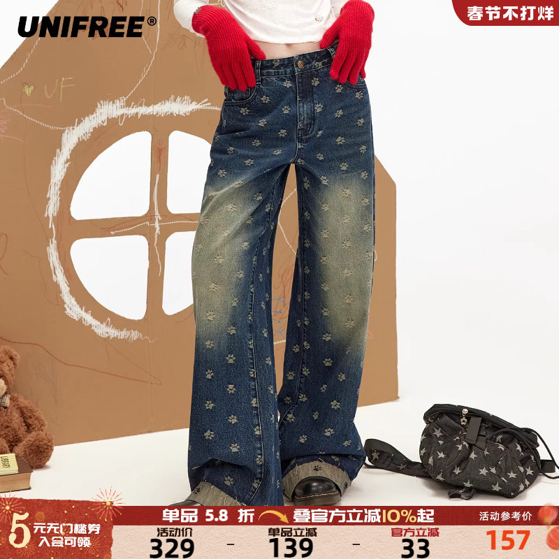 📚 UNIFREE韩系趣味复古牛仔裤女2025新款百搭阔腿宽松显瘦拖地裤子