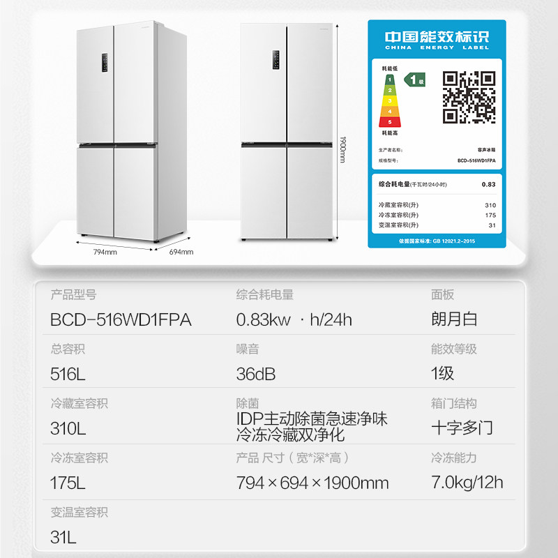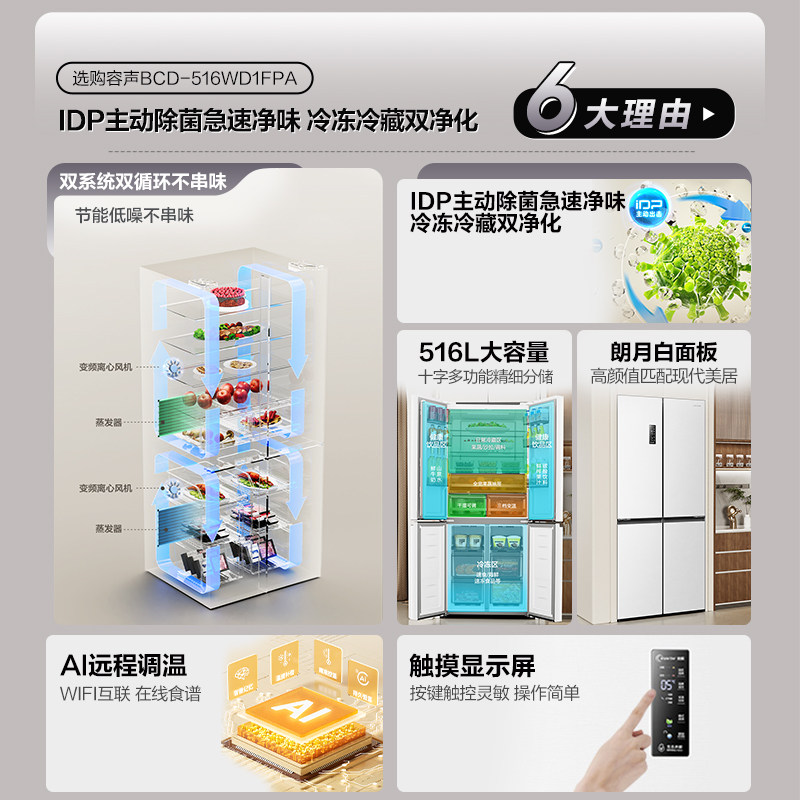 📚 【政府补贴】容声516升双净双系统十字门大容量家用无霜白色冰箱