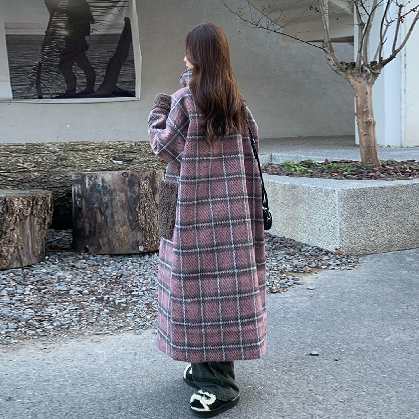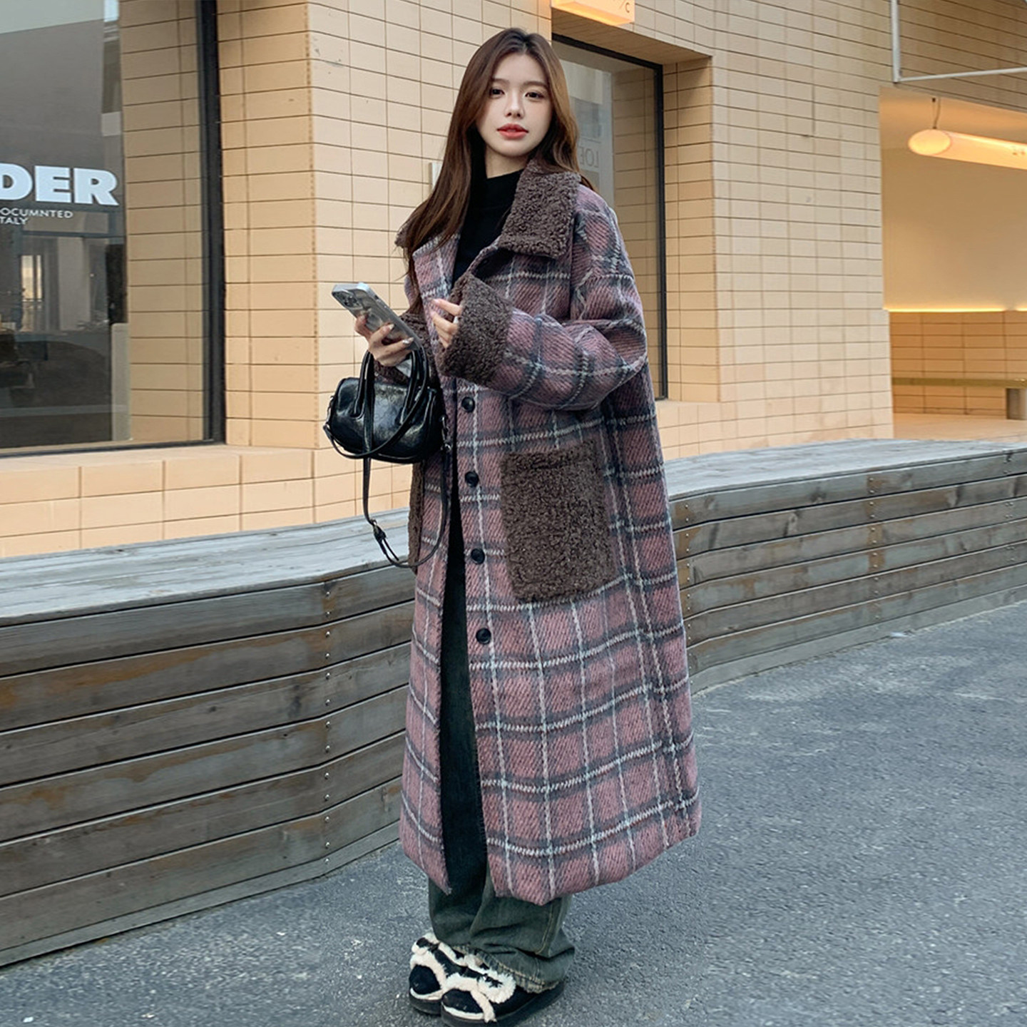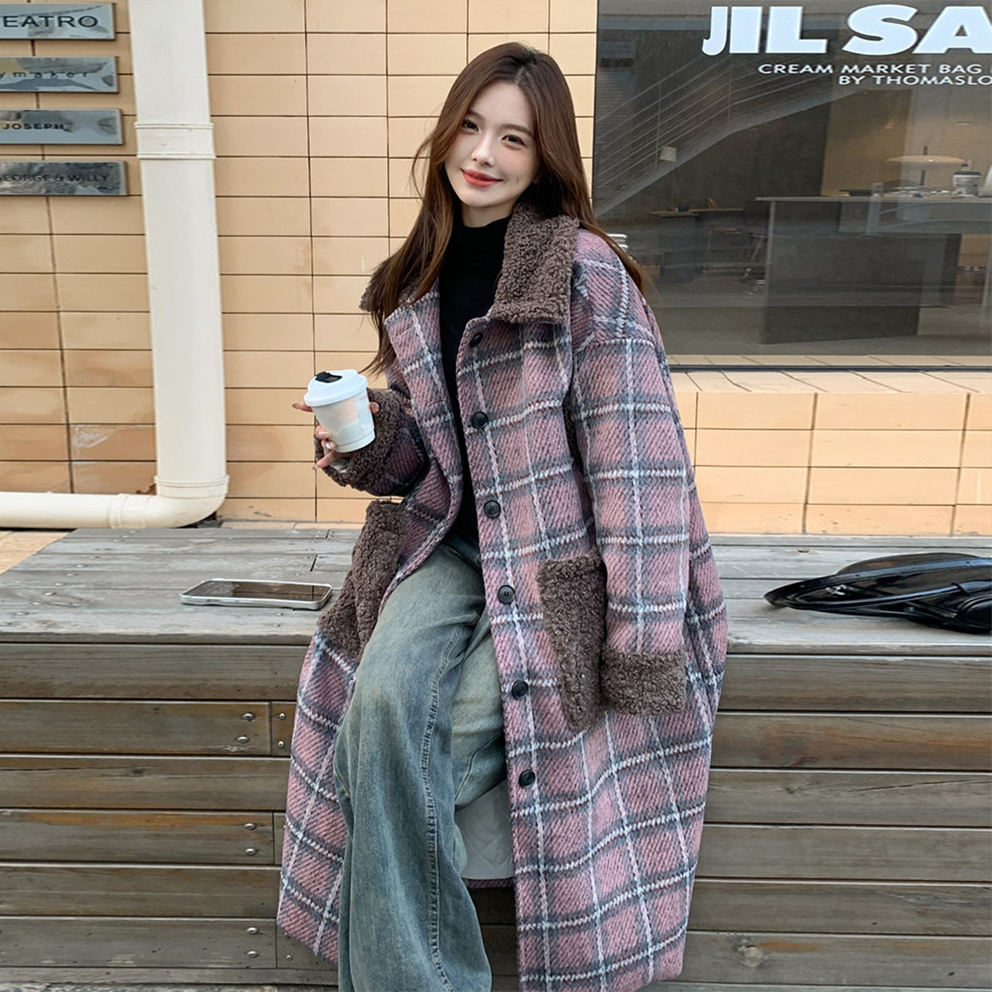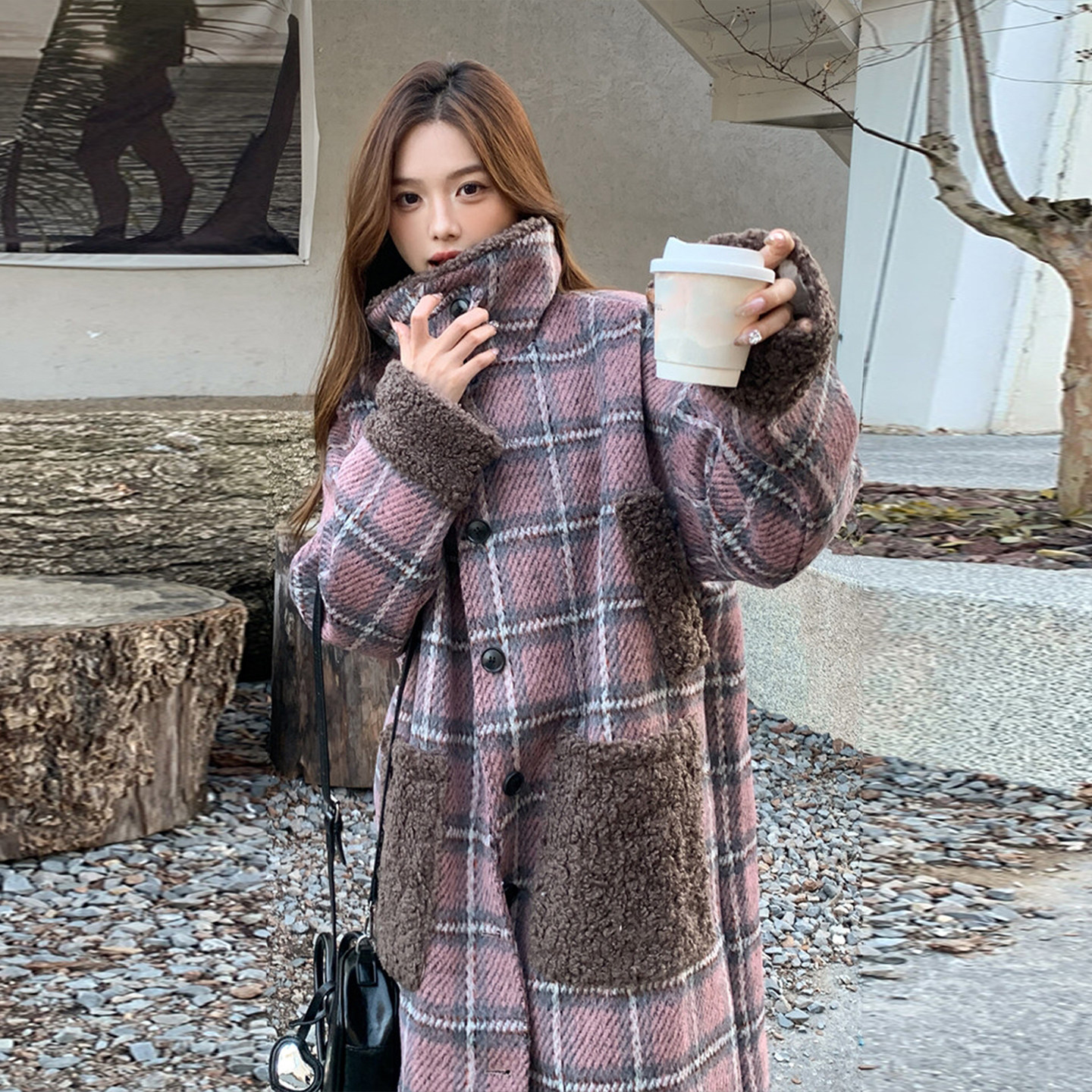 📚 大码胖mm紫色加厚呢大衣女秋冬新款羊羔毛长款格子拼接毛呢外套