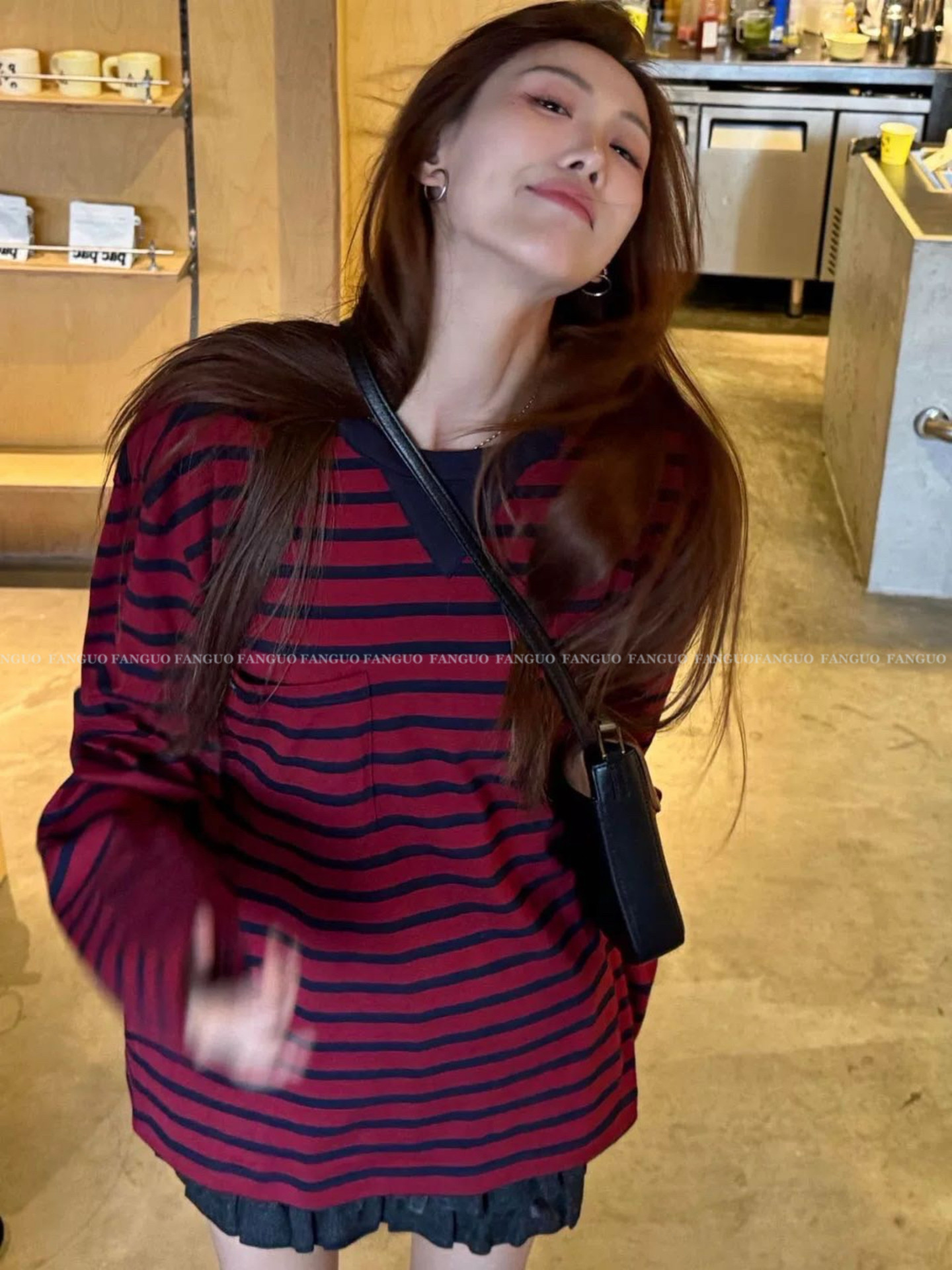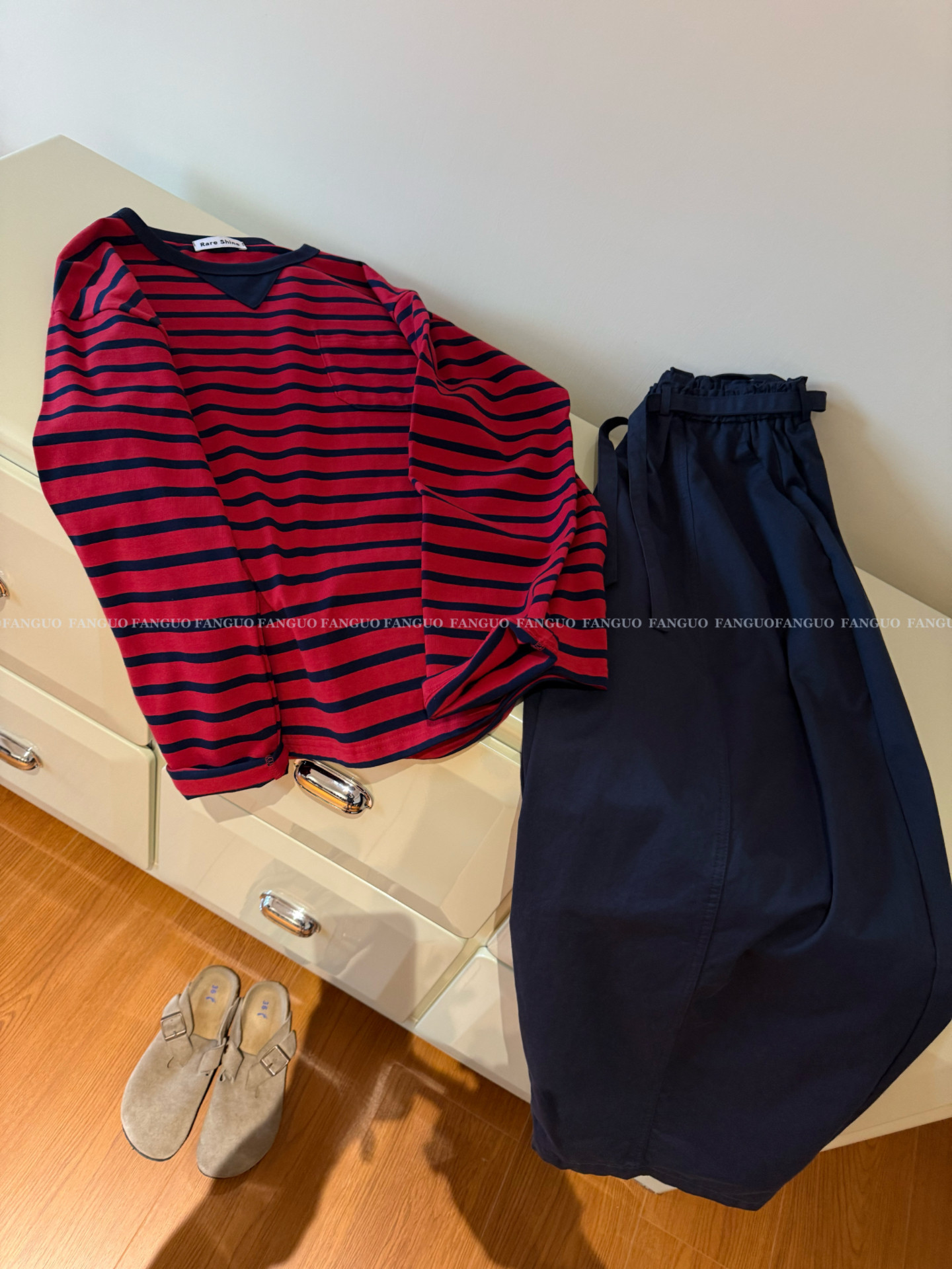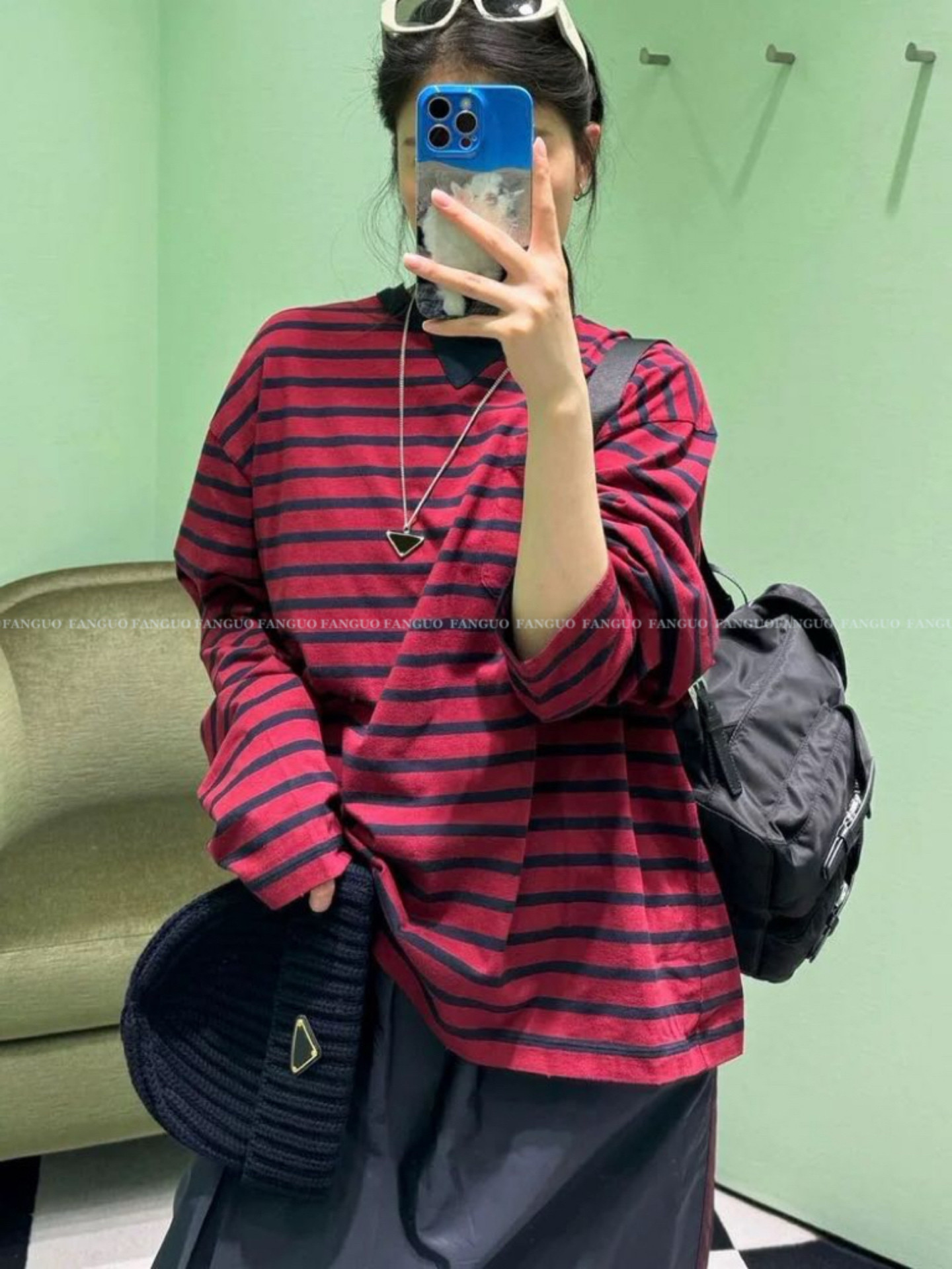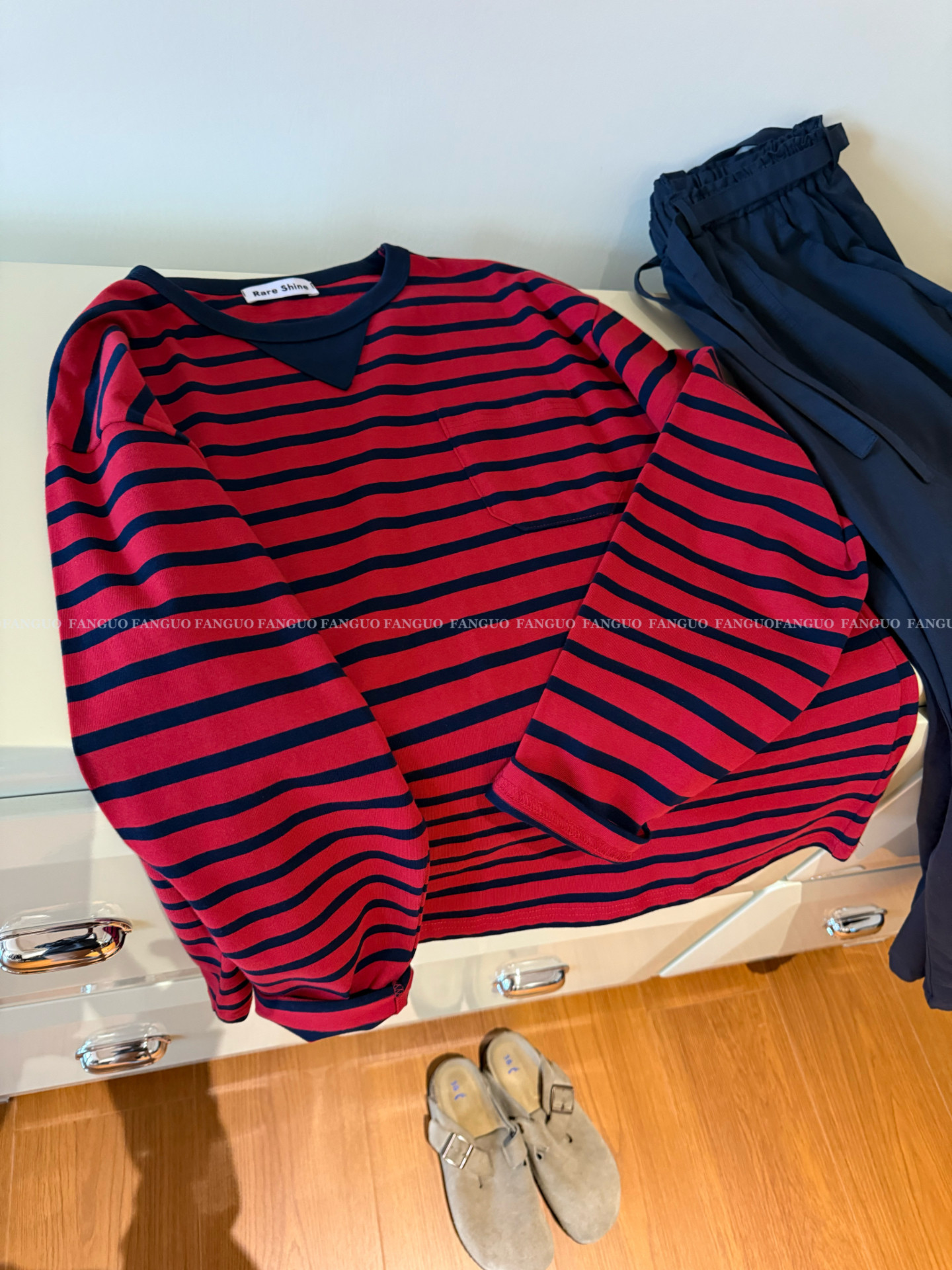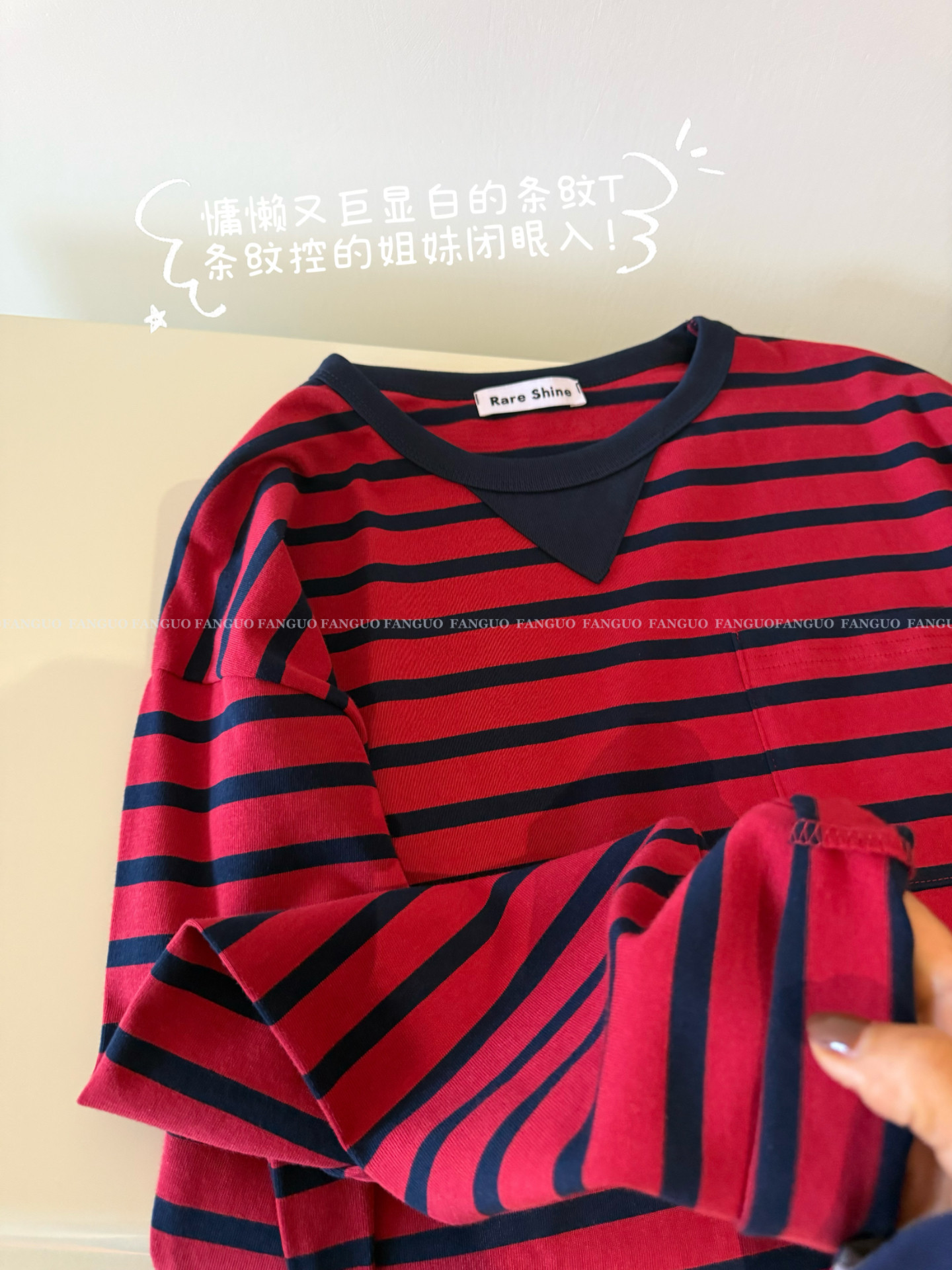 📚 东大门~厚实大版!领子撞色设计感 复古条纹全棉宽松长袖T恤包邮
