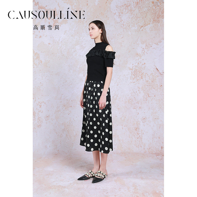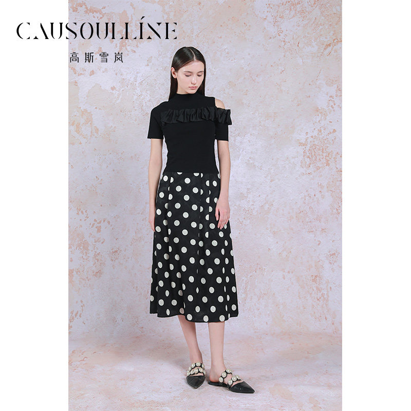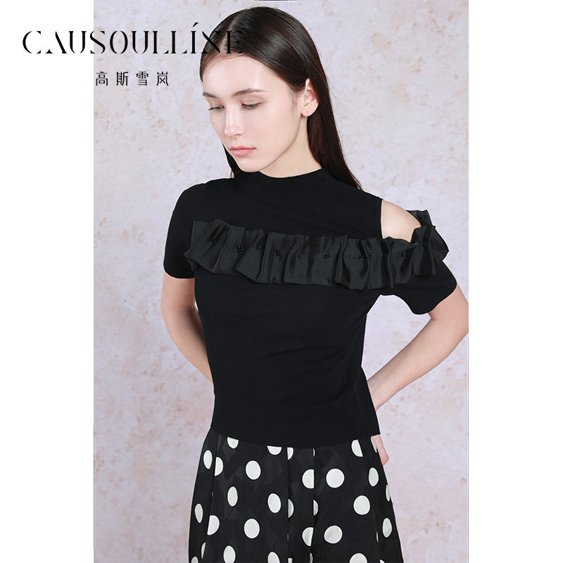 📚 【商场同款】高斯雪岚设计感黑色半高领短袖漏肩针织衫女打底衫潮