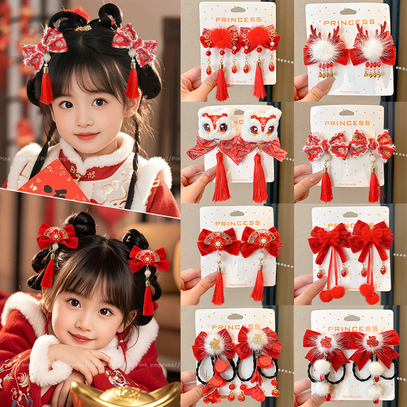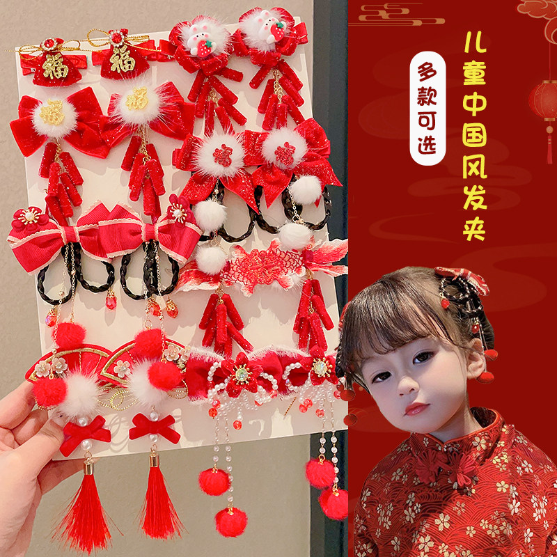 📚 新年儿童发夹女童过年头饰古风汉服发卡蝴蝶结发饰中国风红色夹子