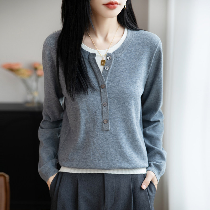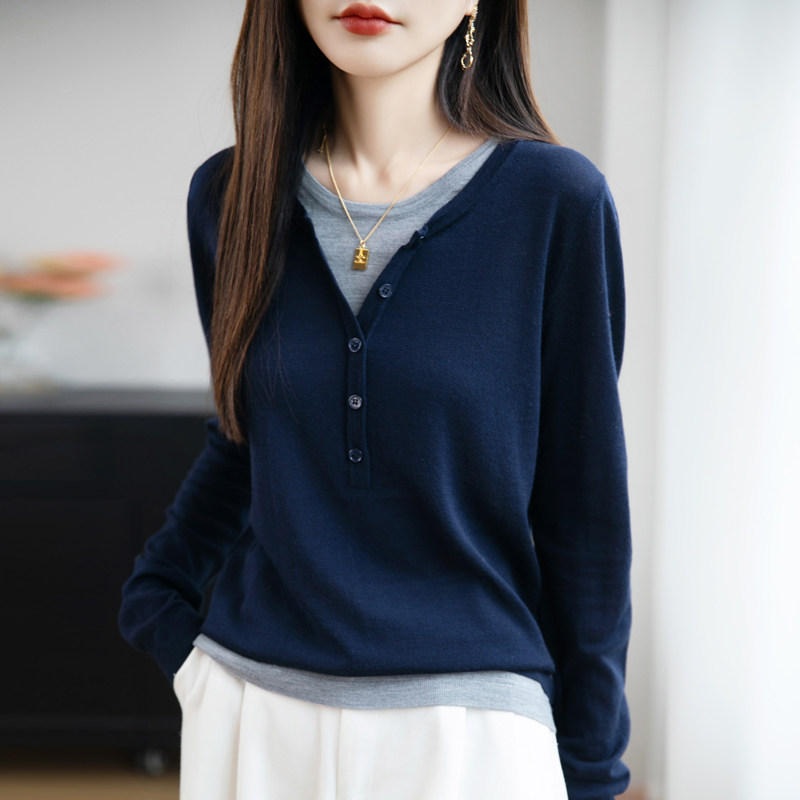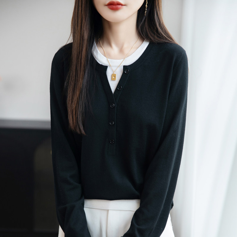 📚 假两件拼接叠穿亨利领毛衣针织衫女秋冬外穿内搭长袖正肩打底上衣