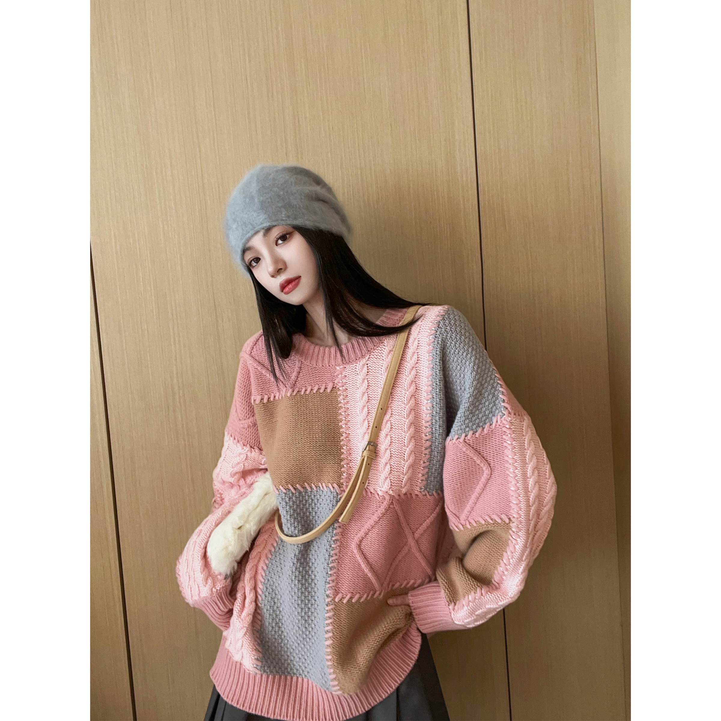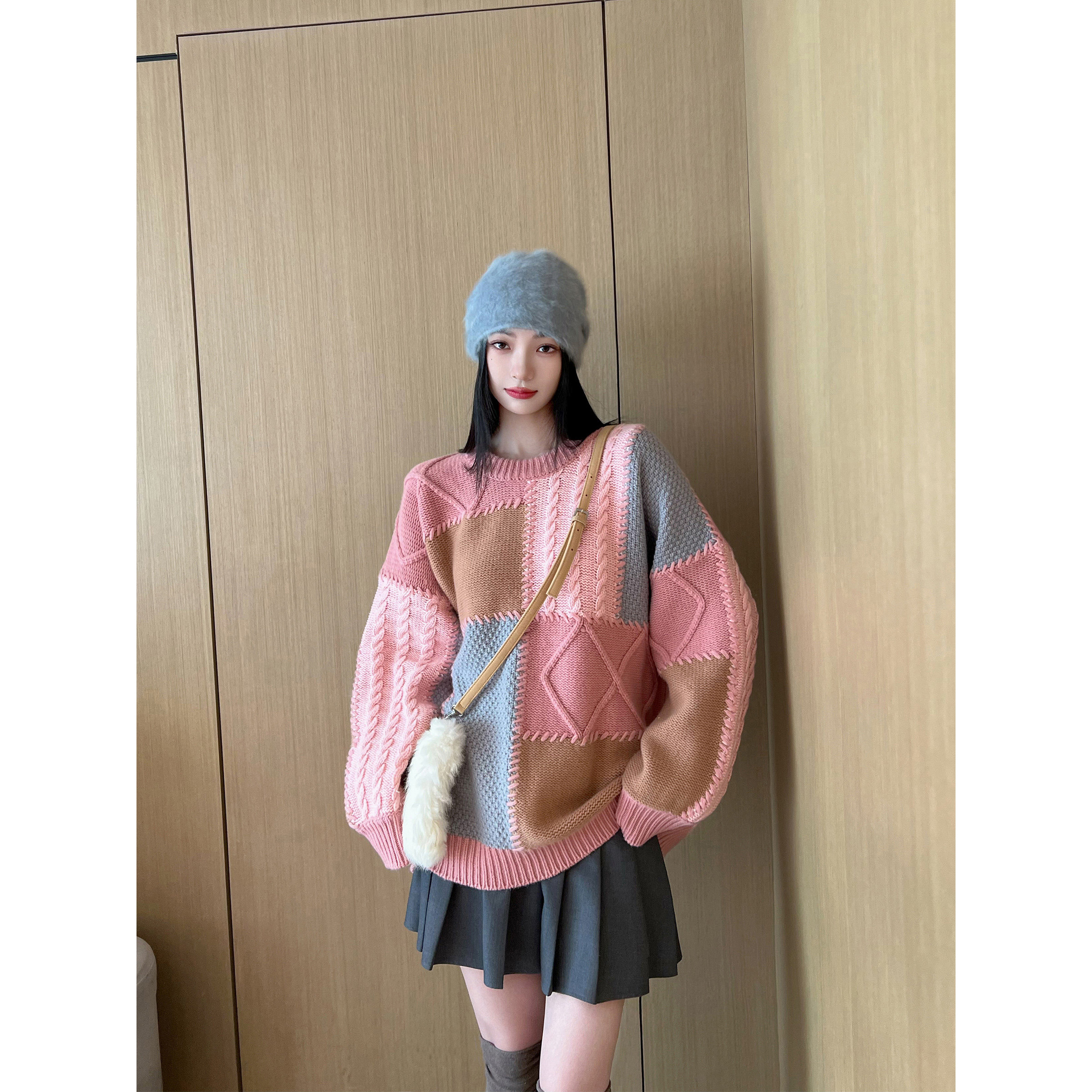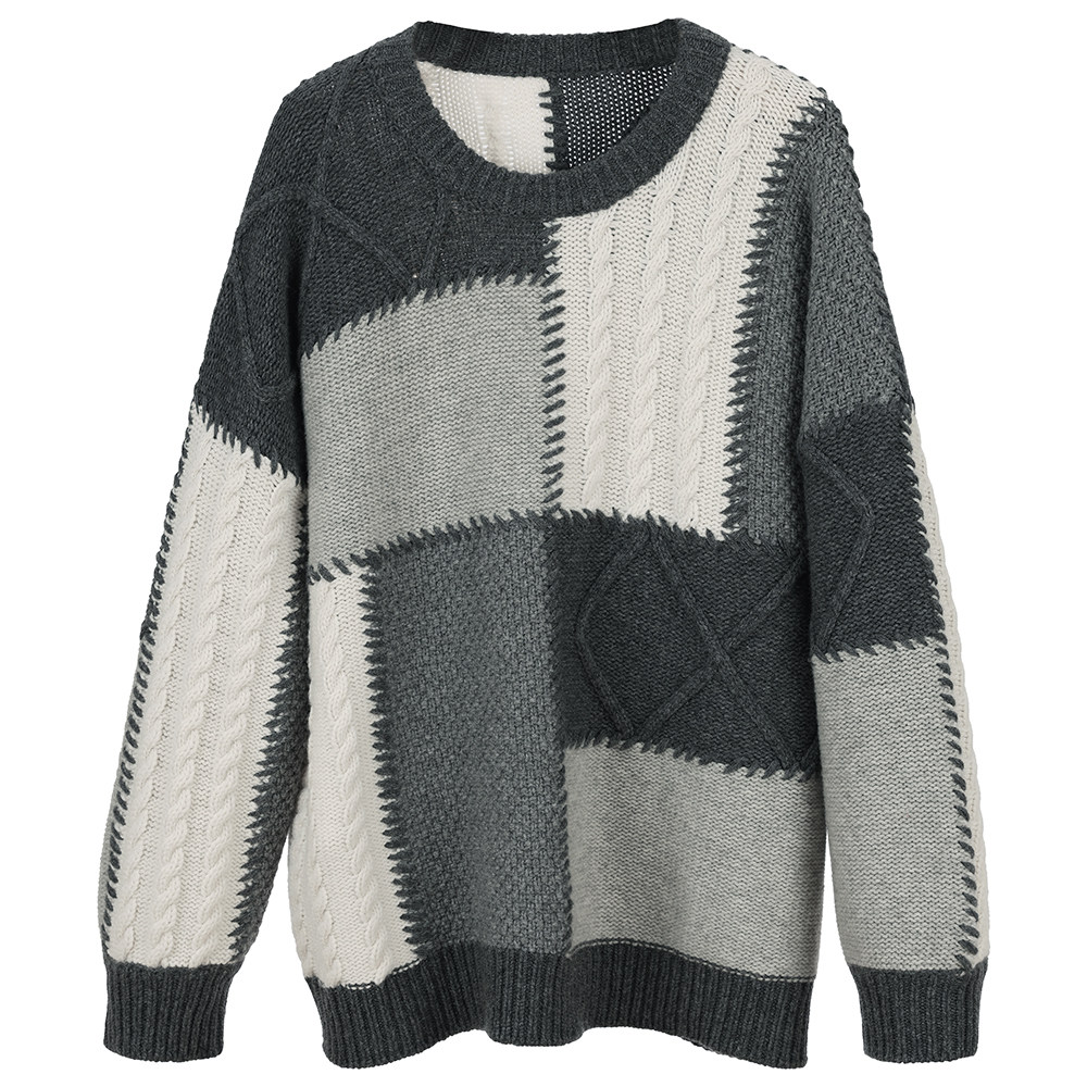 📚 NancyCavally暮染烟岚 软糯亲肤纯羊毛手工拼接格子慵懒针织毛衣