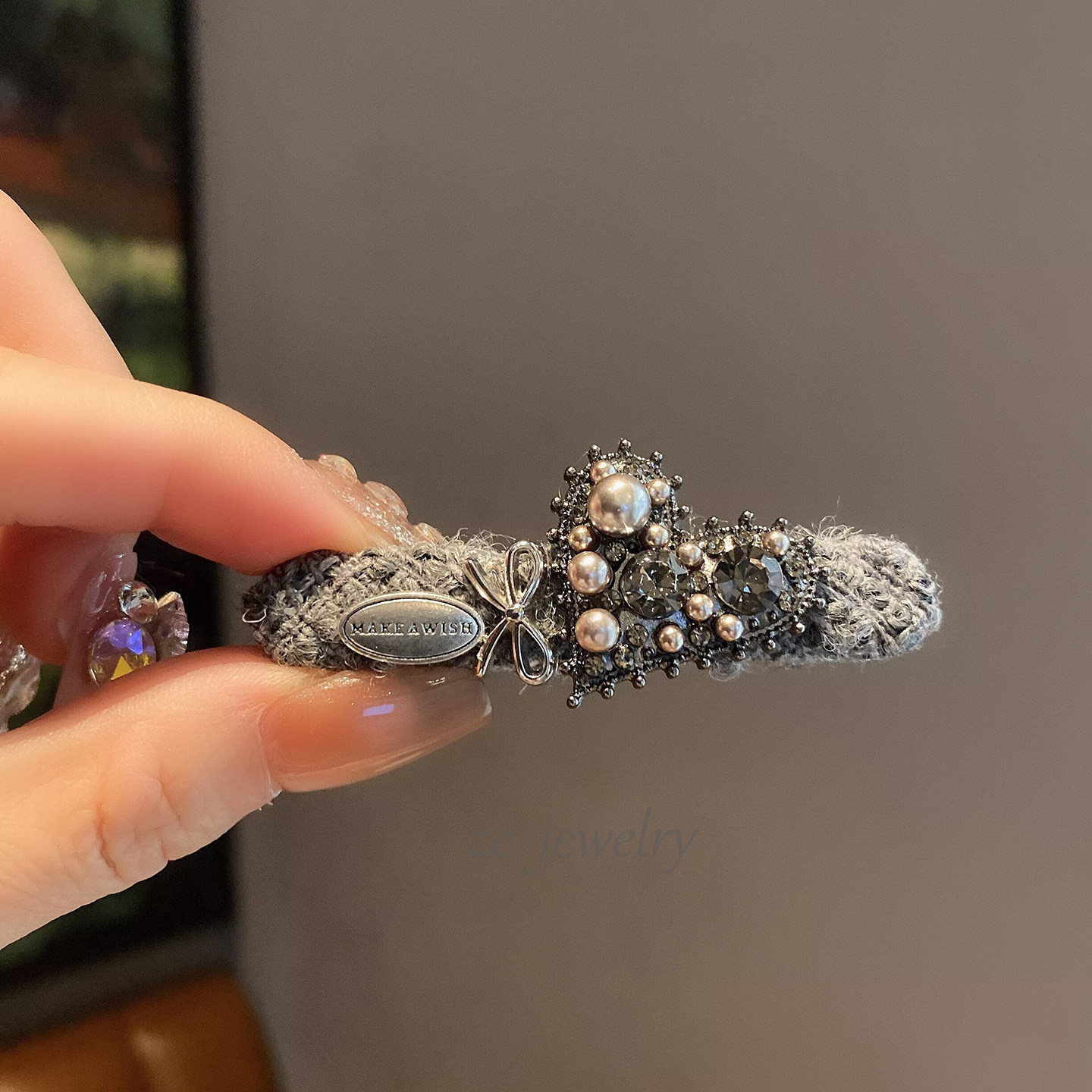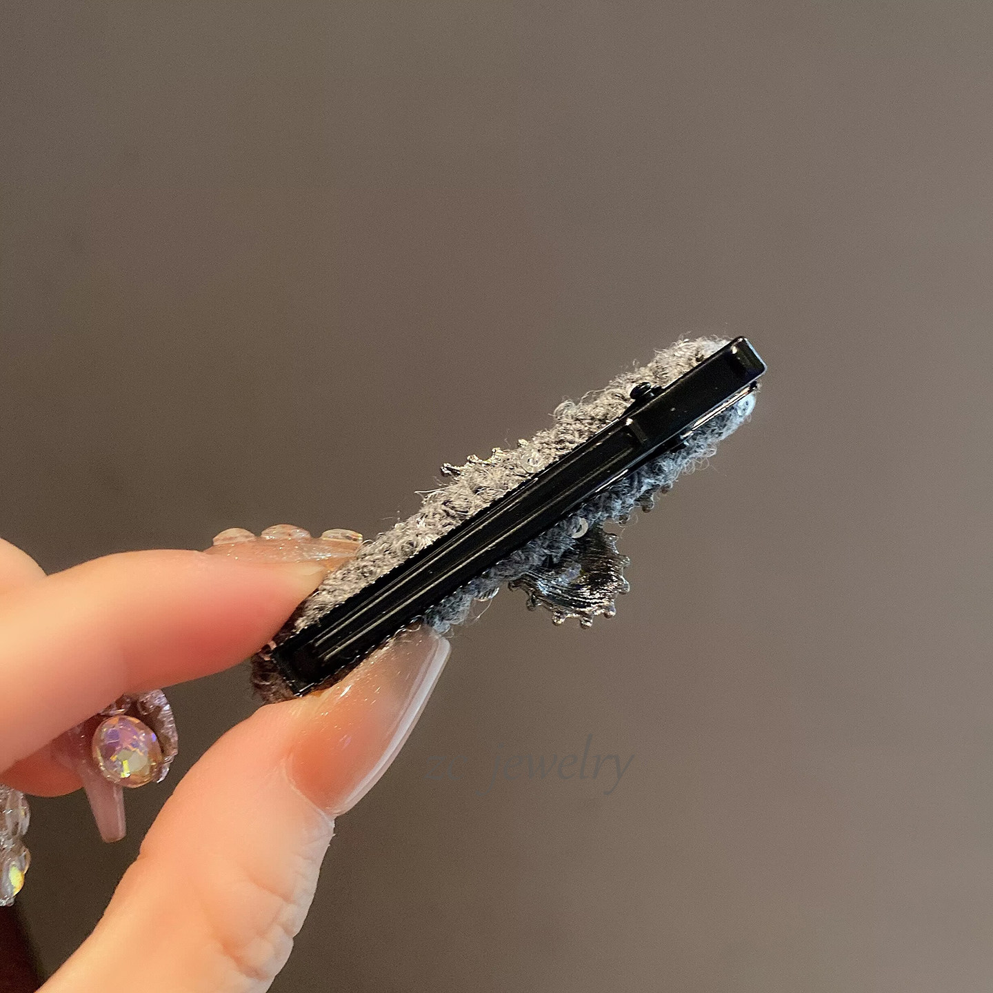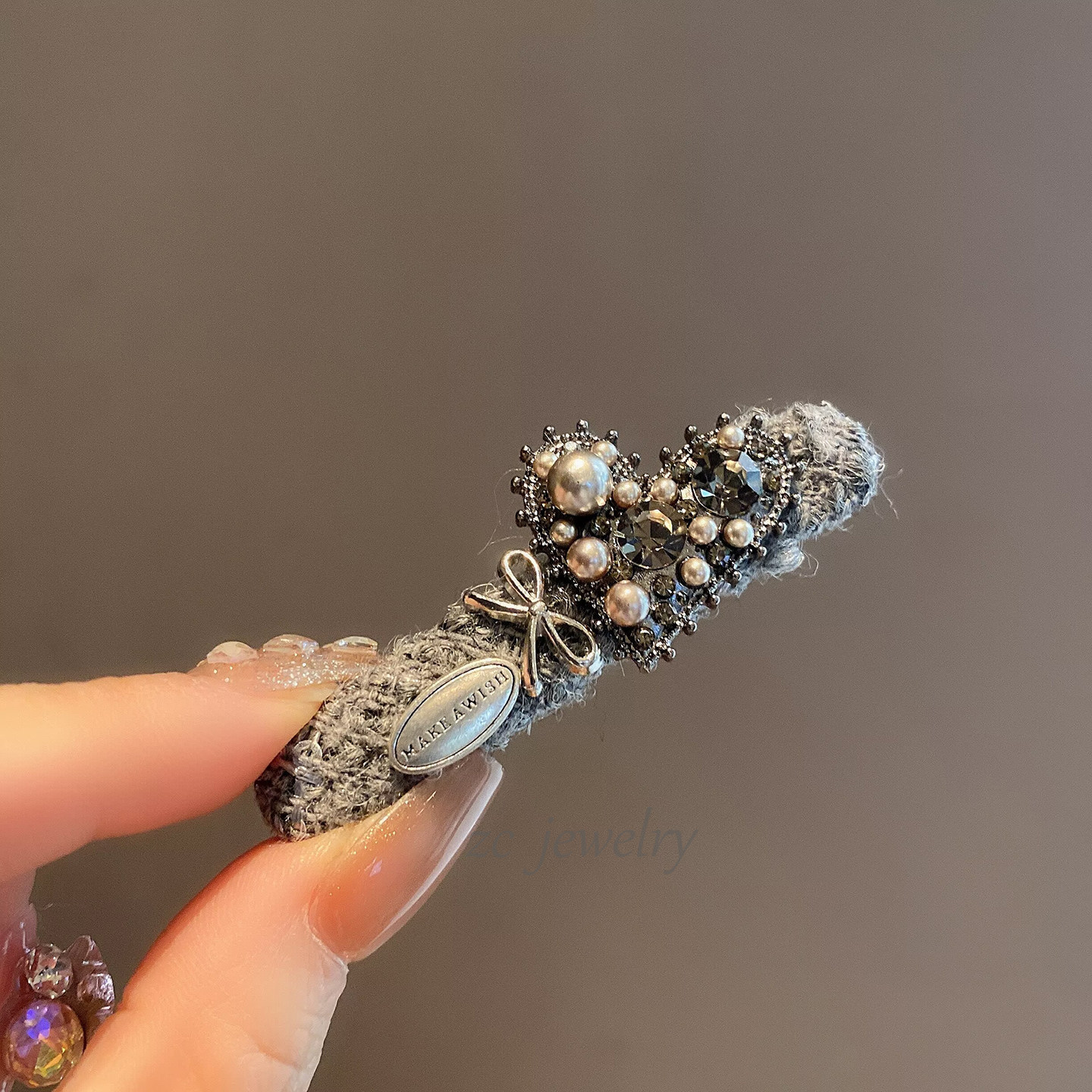 📚 韩版高级感灰色毛呢重工闪钻爱心发夹女时尚精致侧边碎发一字夹