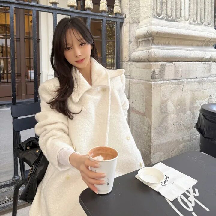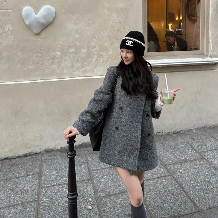 📚 chic 韩系冬季温柔法式时尚后腰带设计感双排扣宽松毛呢外套大衣