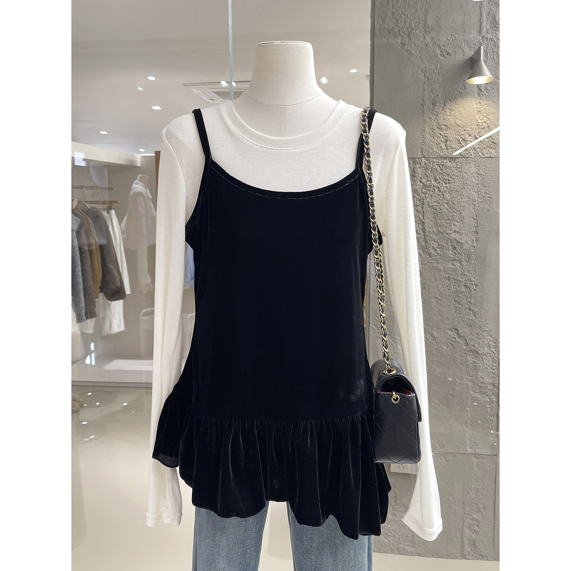 📚 韩系chic甜美荷叶边丝绒吊带+圆领长袖打底衫早春叠穿两件套上衣