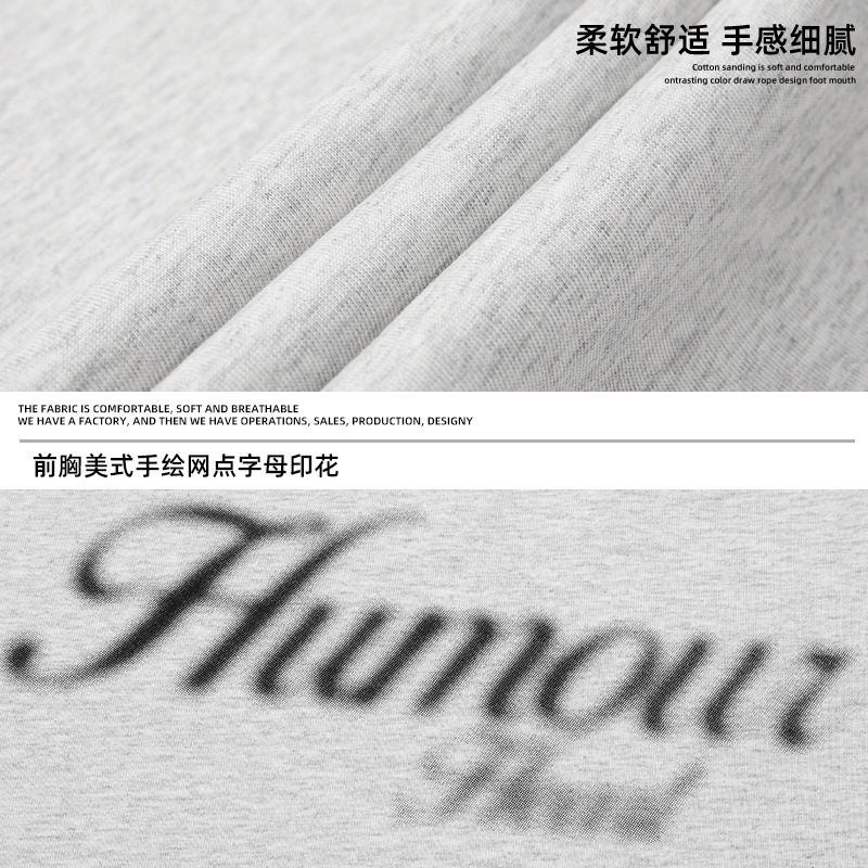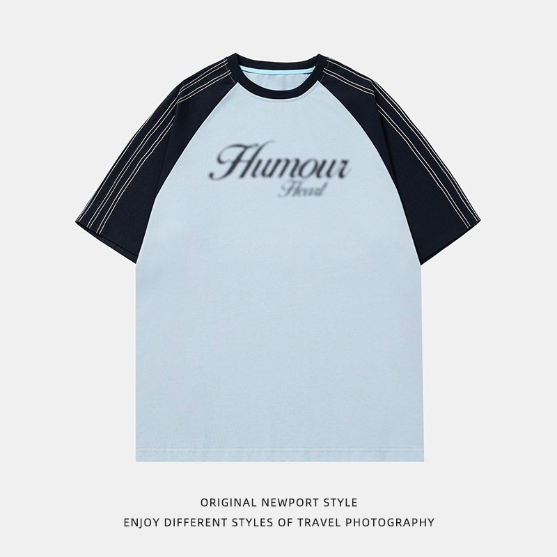 📚 美式复古撞色明线插肩袖短袖T恤男夏季新款模糊网点印花情侣半袖