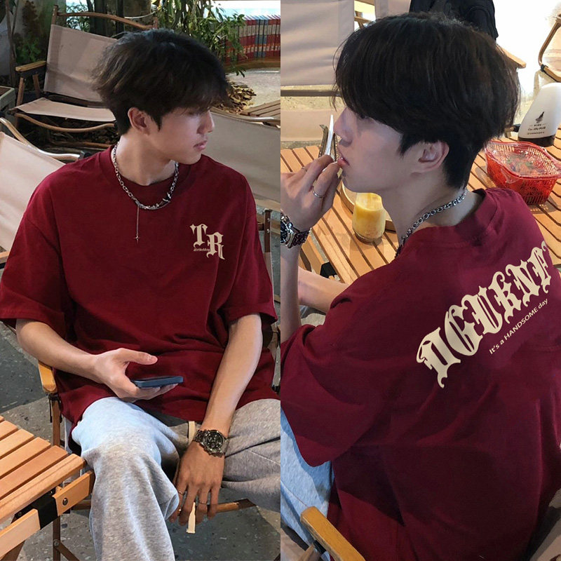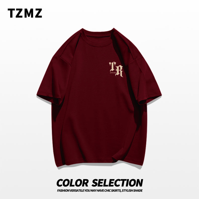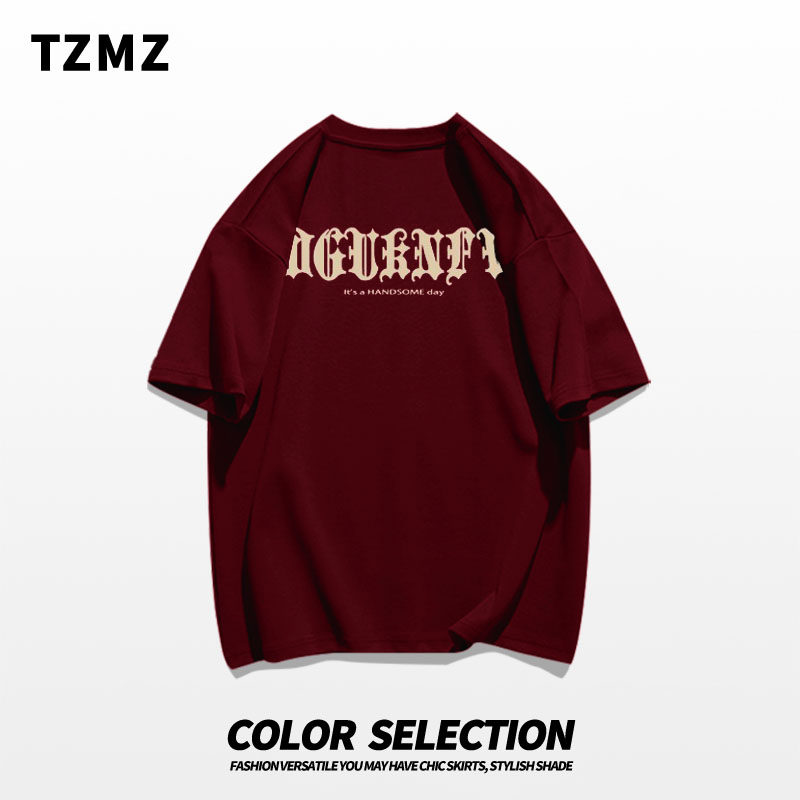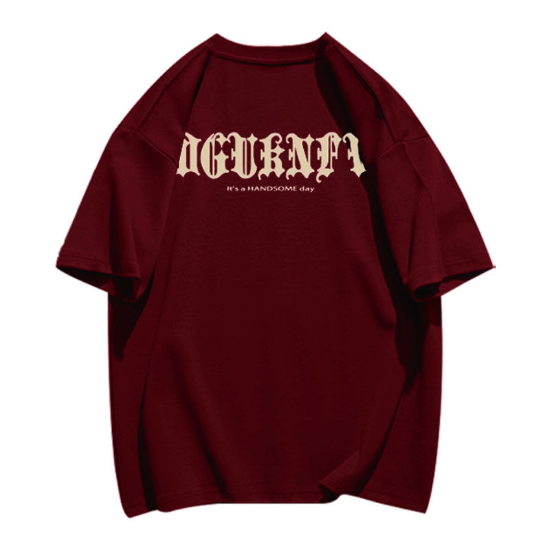 📚 美式vibe重磅纯棉短袖t恤男夏季嘻哈高街潮牌字母印花酒红色上衣