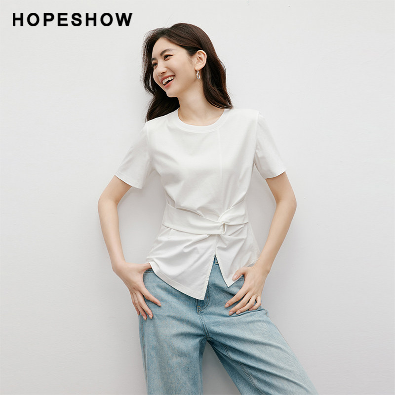 📚 红袖时尚不对称立体扭结T恤hopeshow2024夏新款圆领套头纯色短袖
