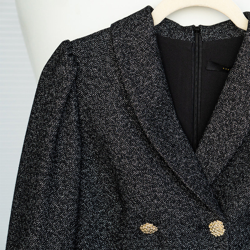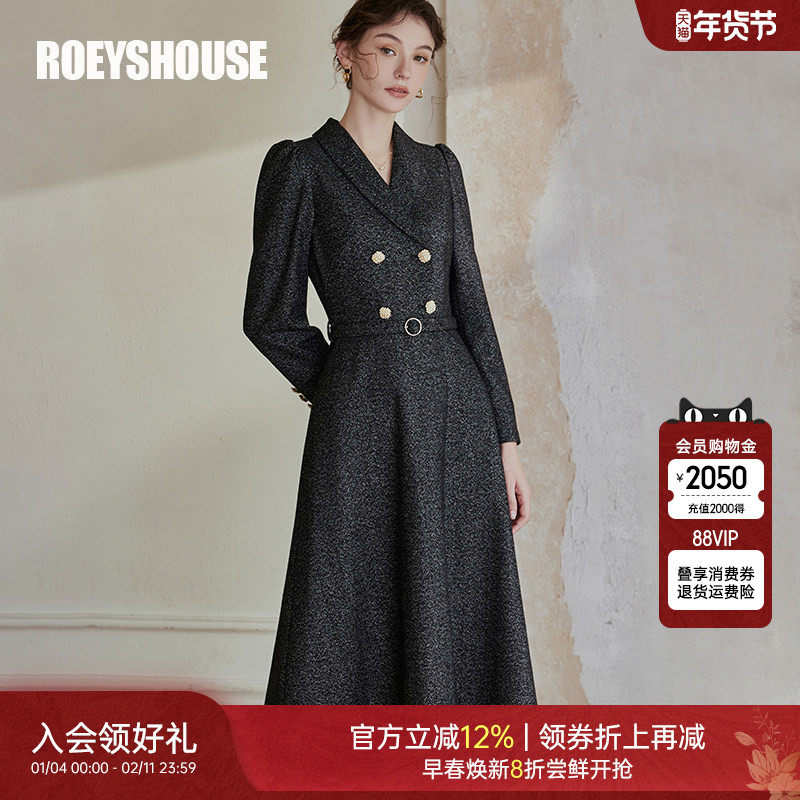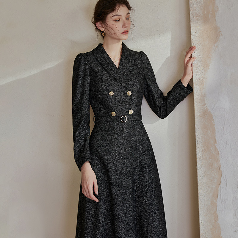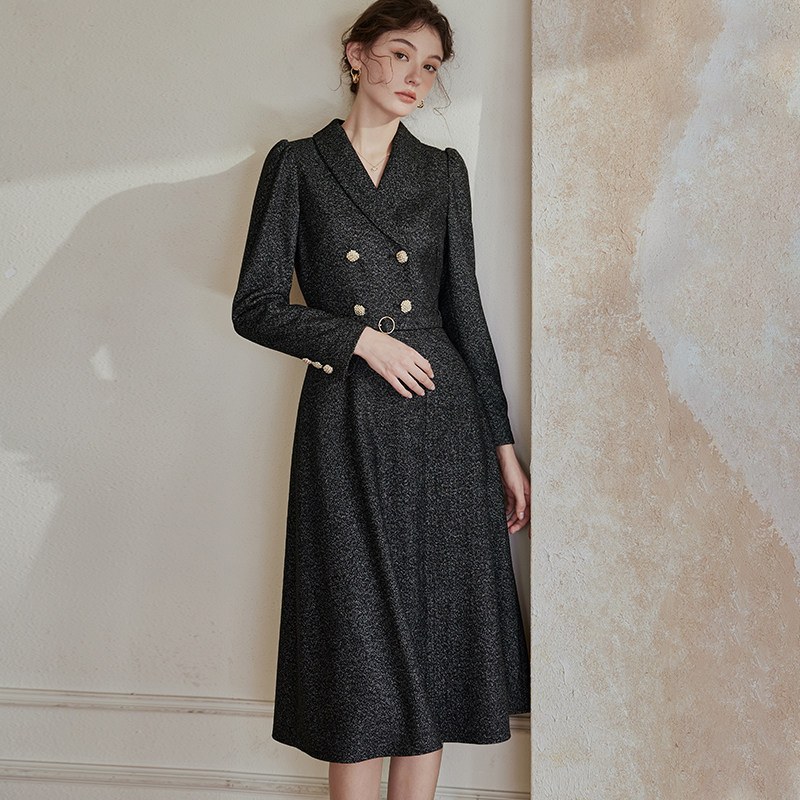 📚 罗衣知性OL风格毛呢西装连衣裙女春优雅通勤黑色大摆连衣裙07927