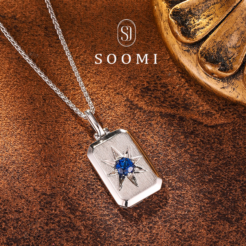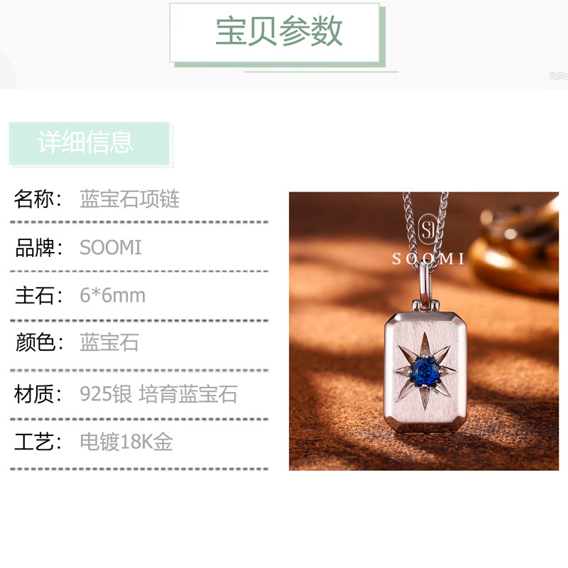 📚 [SOOMI六芒星]人工培育皇家蓝宝石项链大气方块925银牌男士吊坠