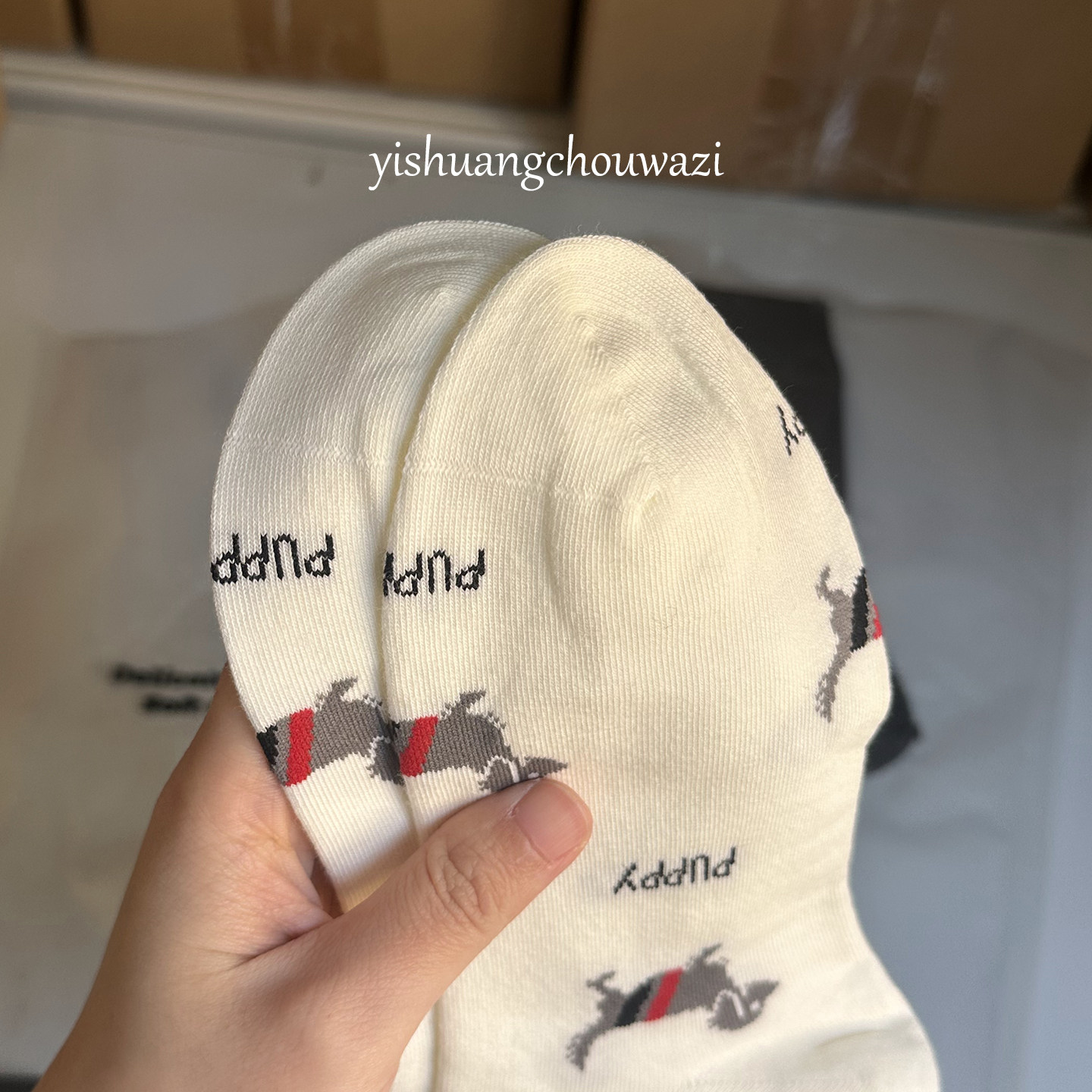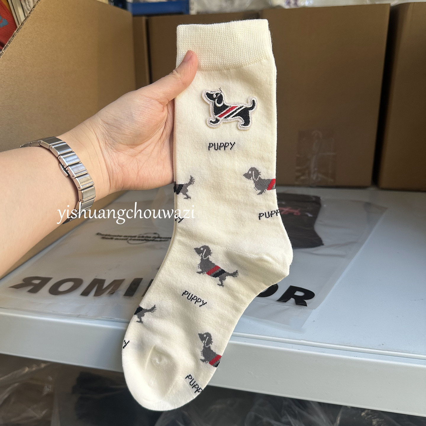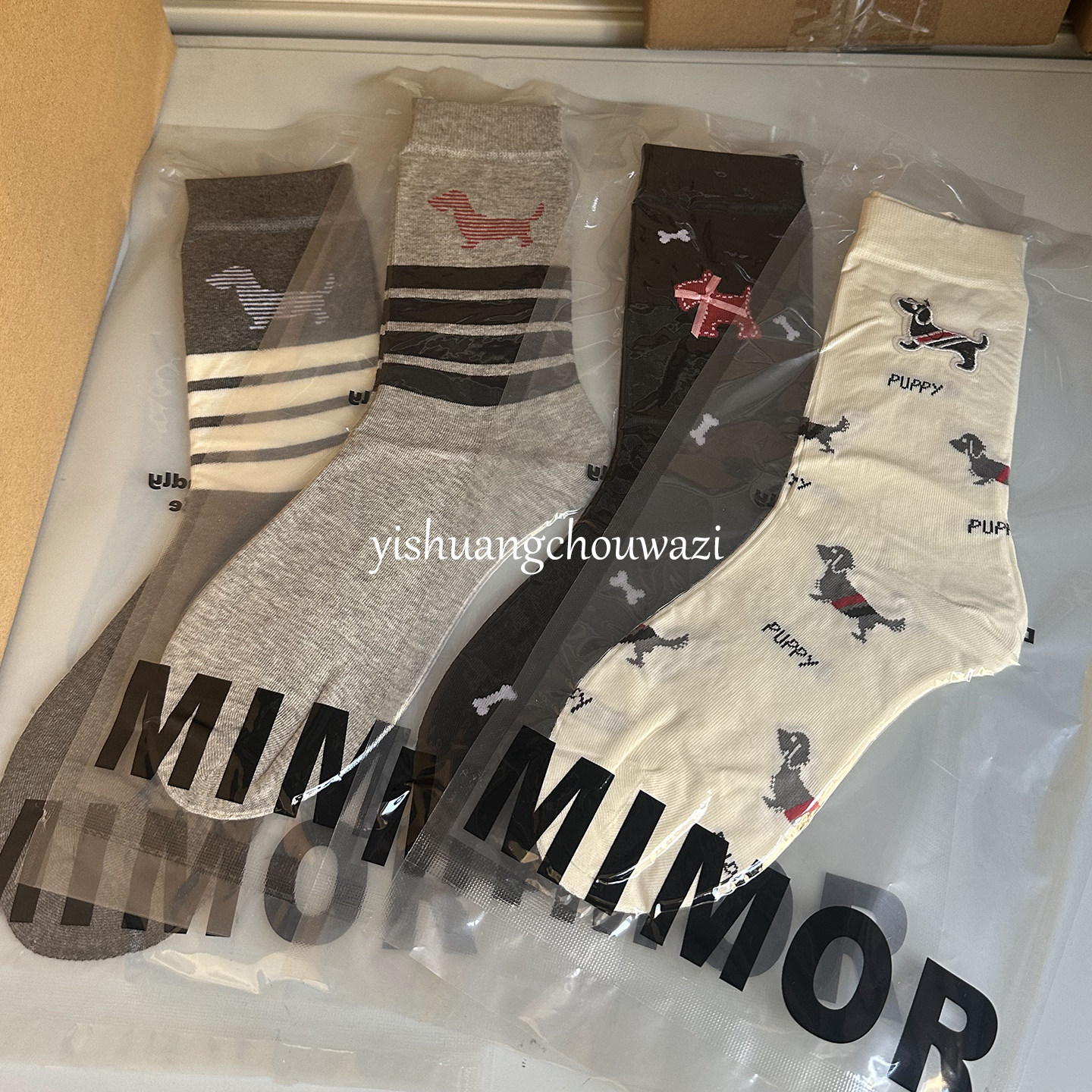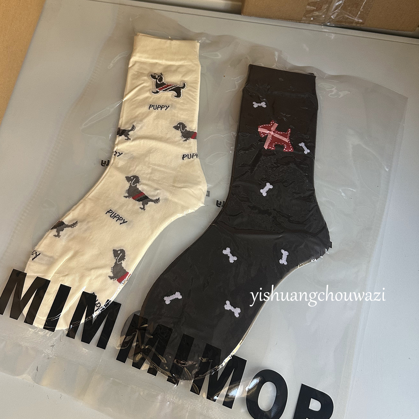 📚 欧货小狗布标蝴蝶结四杠百搭高筒棉袜真空包装质感韩版四季个性长