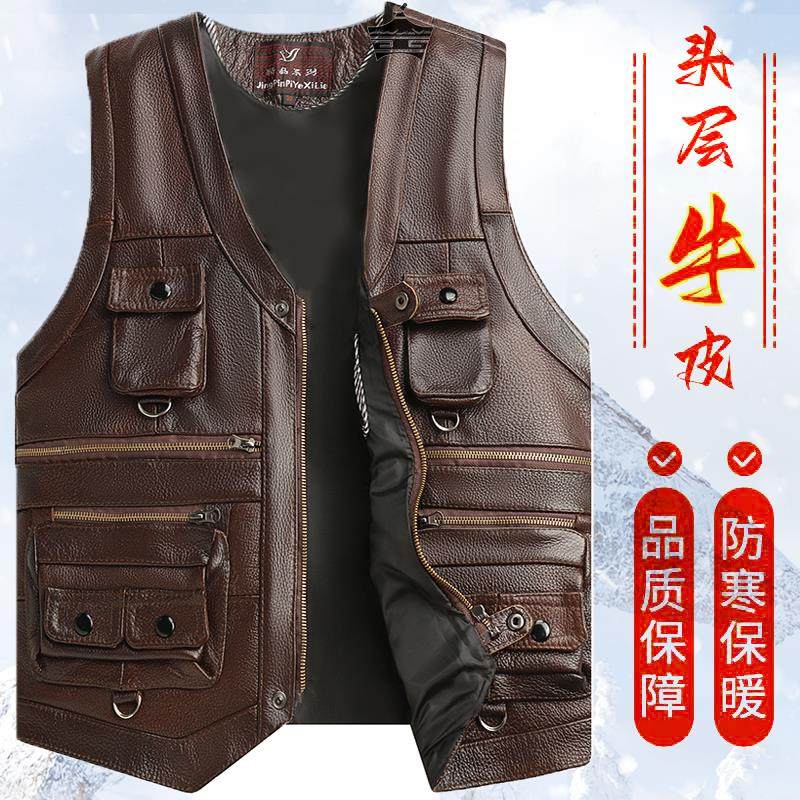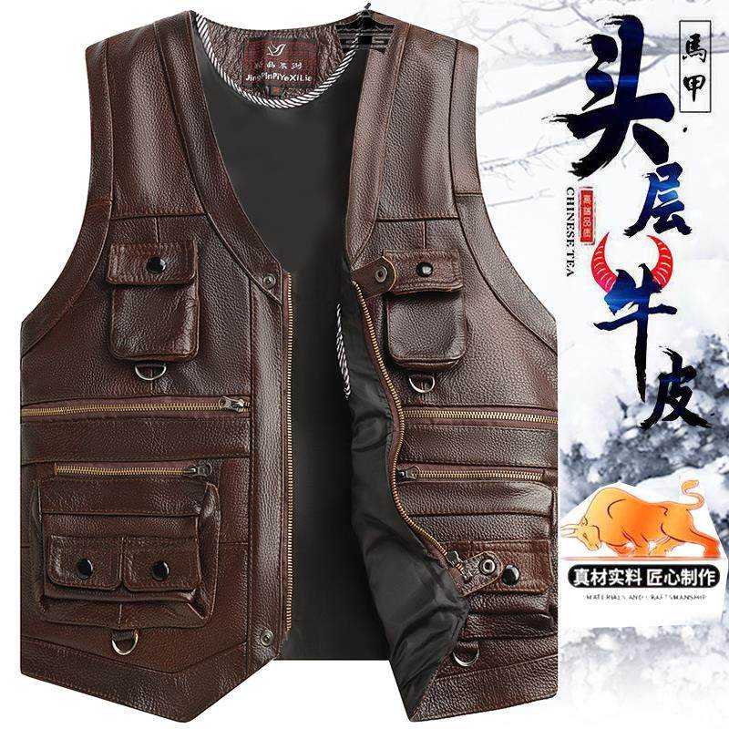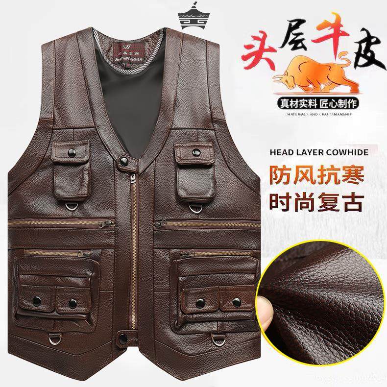 📚 真皮马甲男中老年头层牛皮马甲多兜春秋冬季爸爸装休闲背心记者服