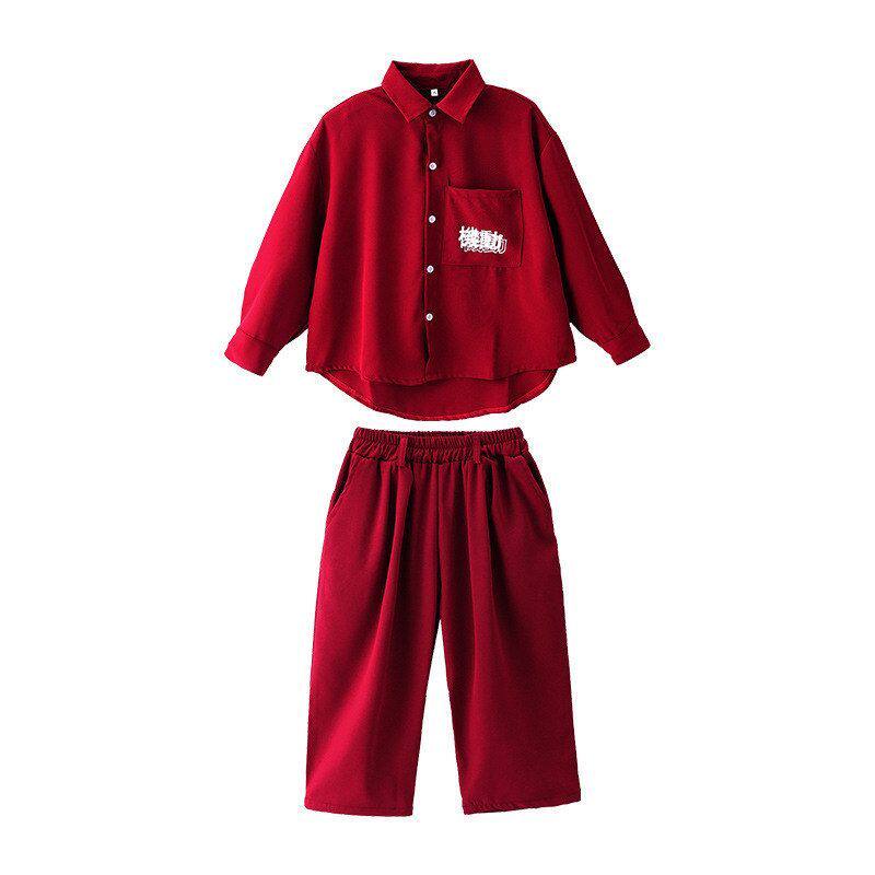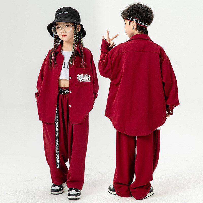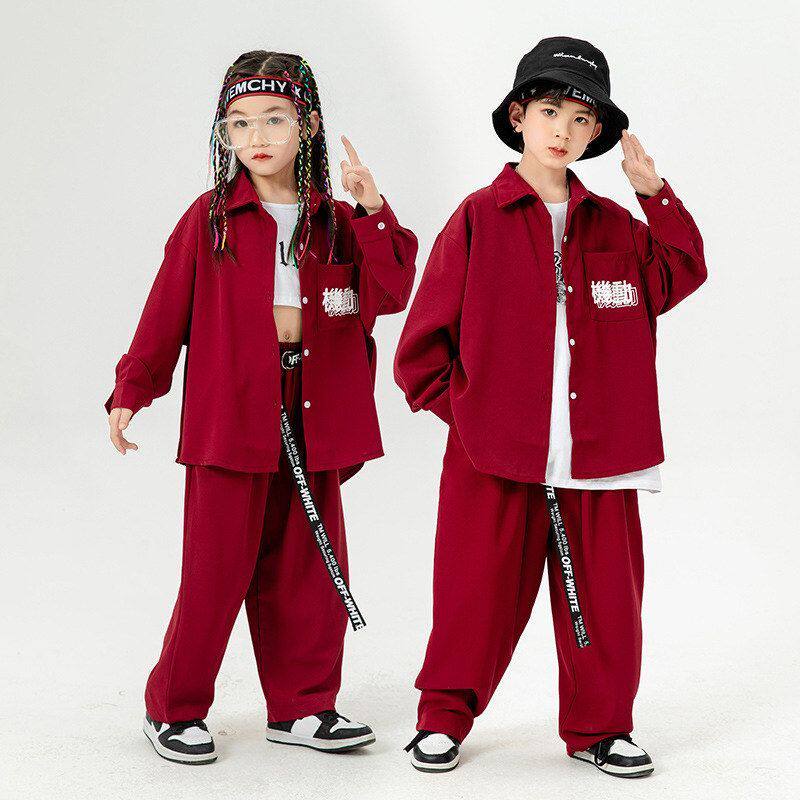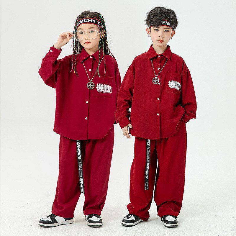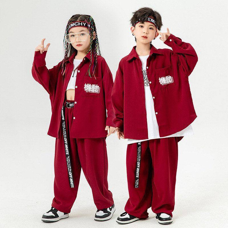 📚 儿童街舞服春秋男童嘻哈表演服酒红衬衣女童露脐爵士演出服架子鼓