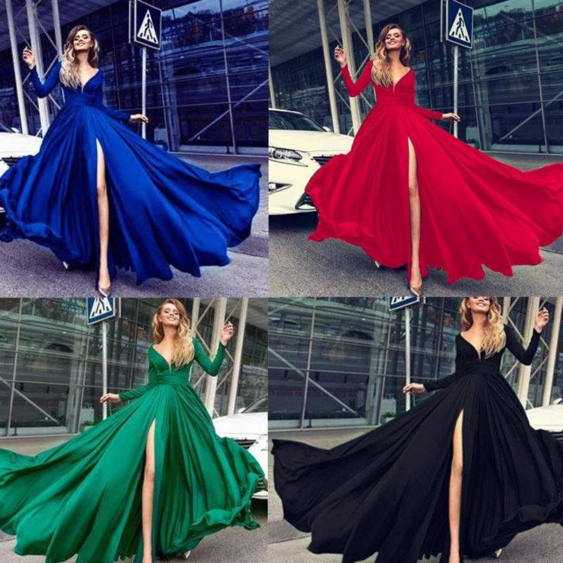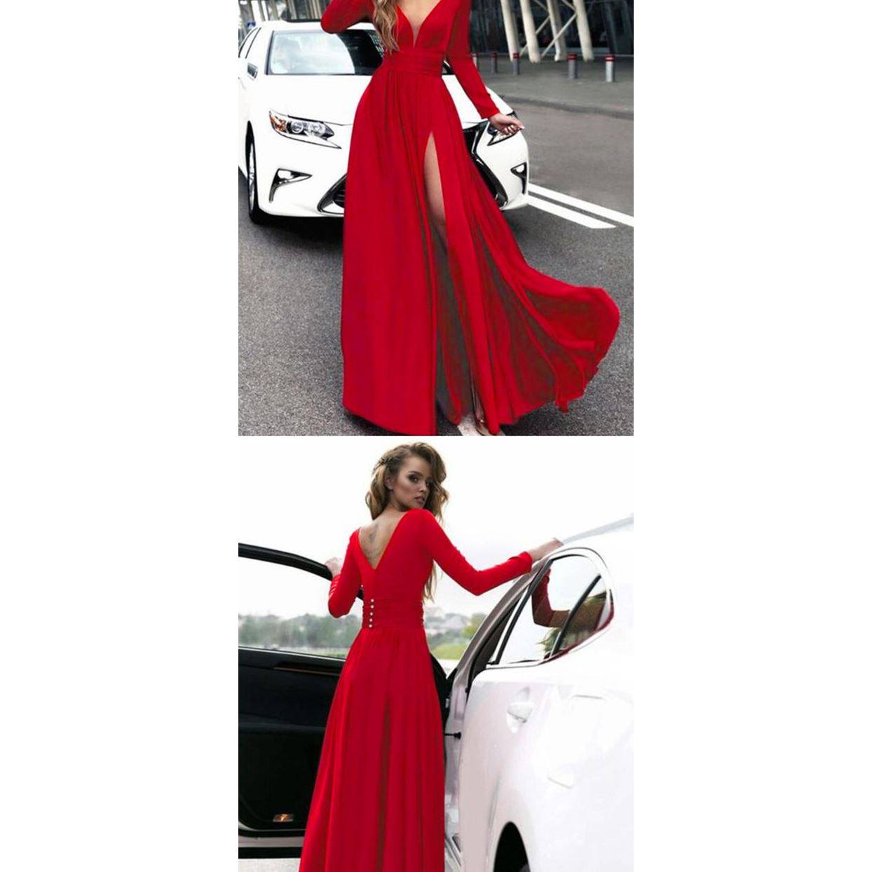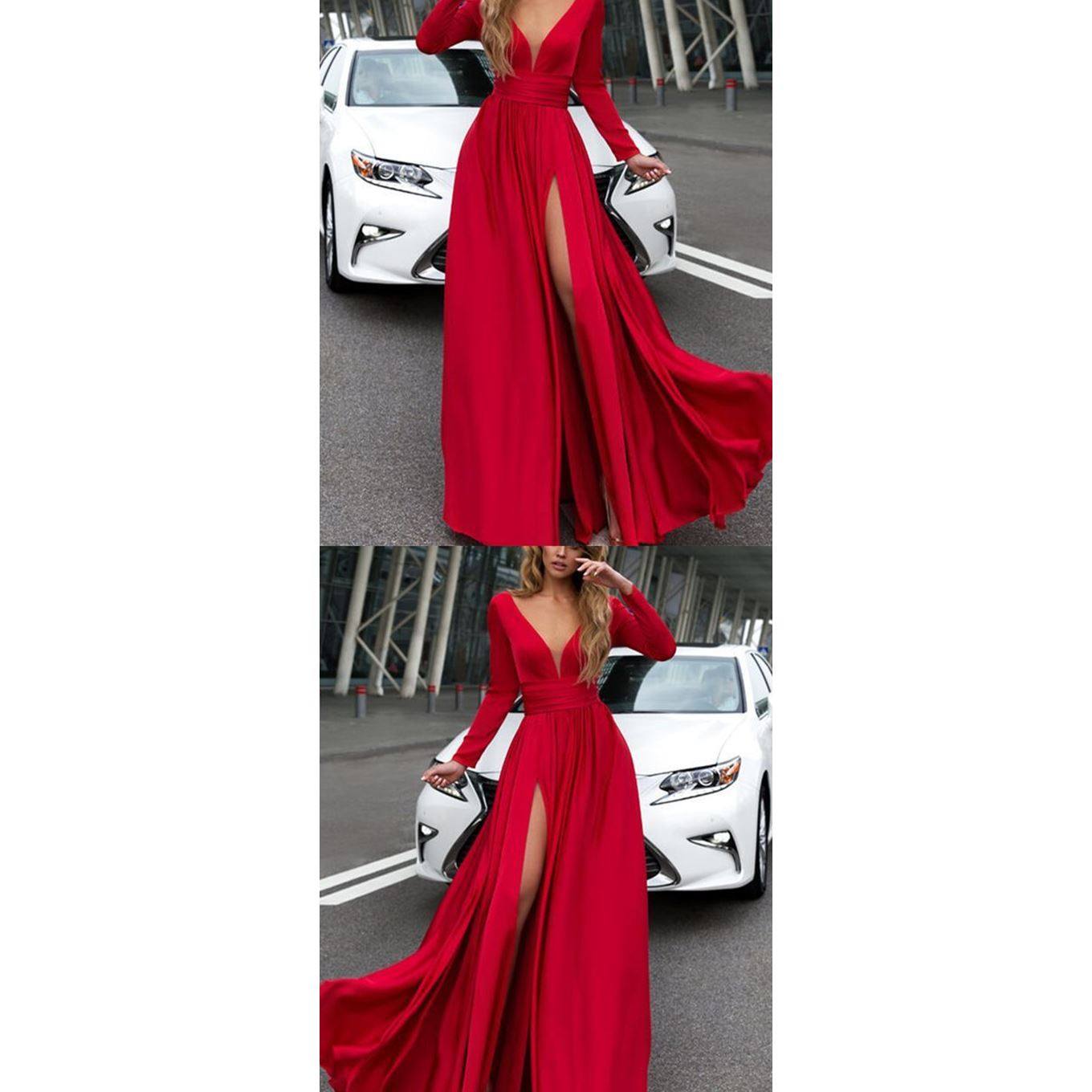 📚 Women red party dress Lady Long-sleeved Evening Gown红色礼服