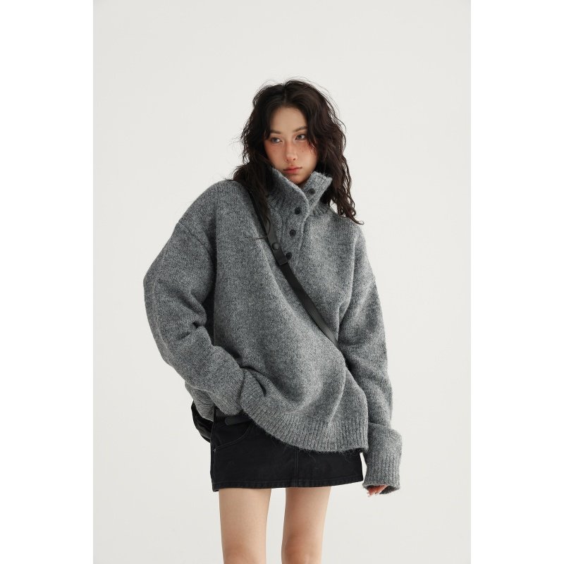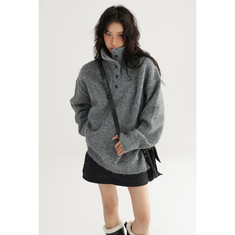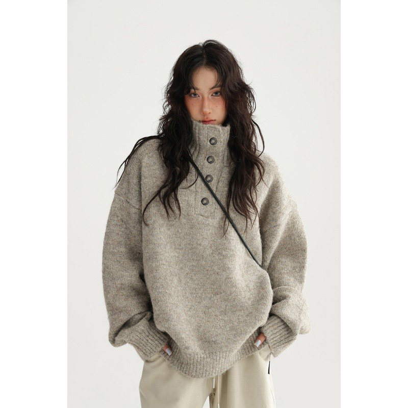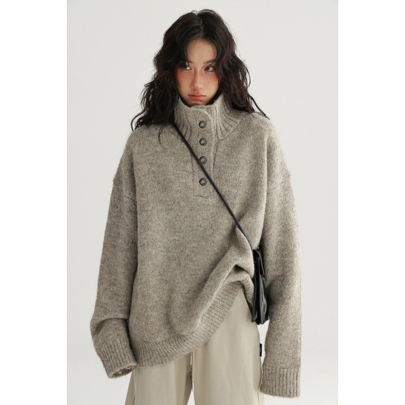📚 燕麦色立领纽扣亨利领套头毛衣女秋冬加厚保暖松弛感毛针织衫上衣