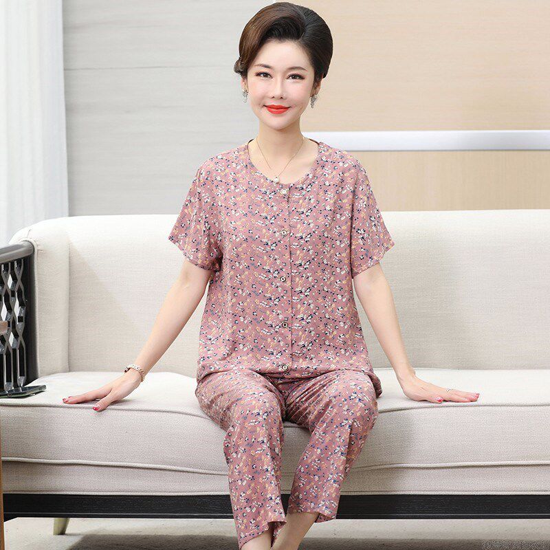 📚 睡衣女夏纯棉棉绸短袖妈妈开衫女装中老年绵绸居家外穿家居服套装