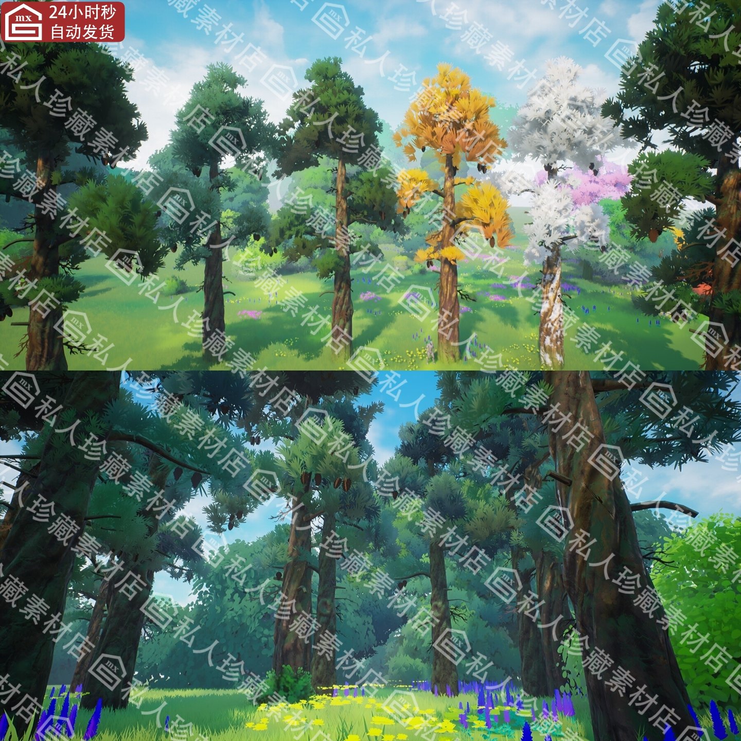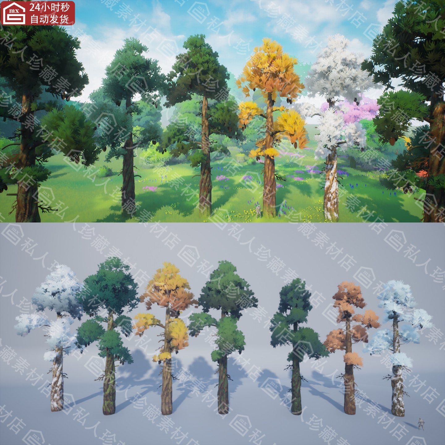 📚 UE5风格化不同季节蓬松树和松叶子模型资产Stylized Fluffy Pines