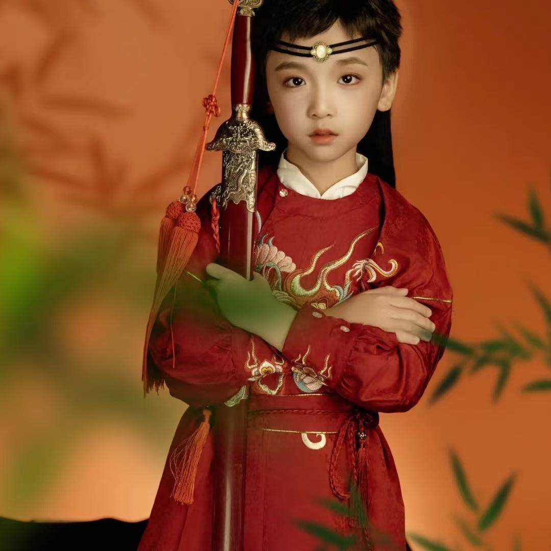 📚 浴火凤凰男童汉服刺绣儿童红色小少爷明制飞鱼装侍卫唐代圆领袍