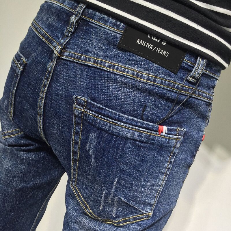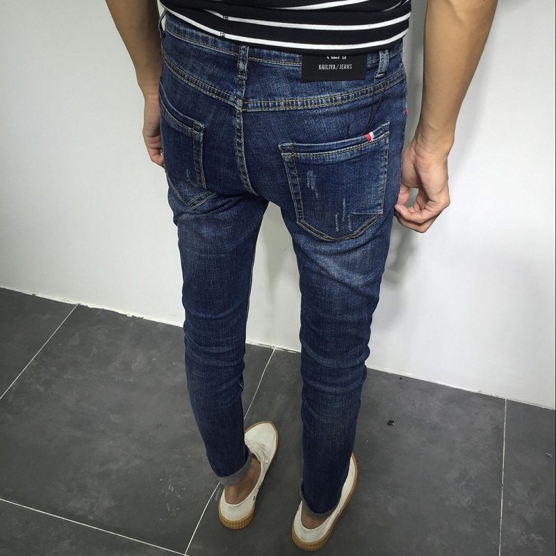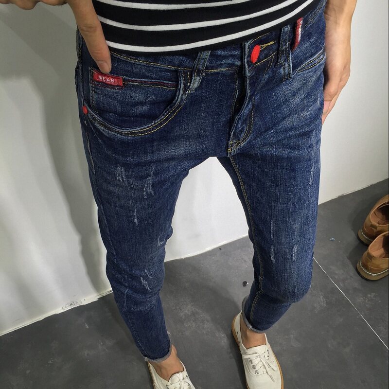 📚 春秋潮男牛仔裤紧身小脚九分裤修身韩版潮流深蓝做旧社会小伙长裤