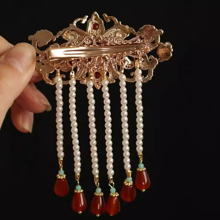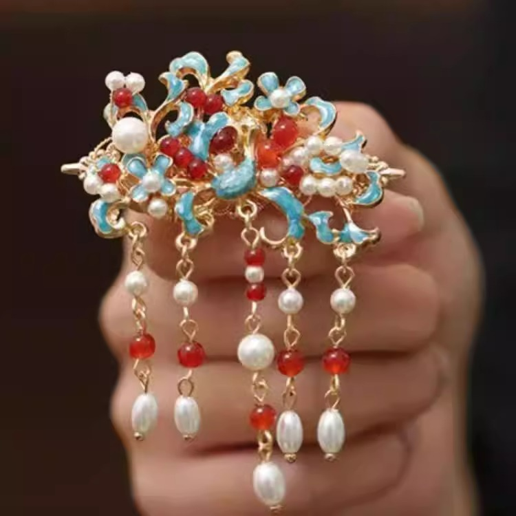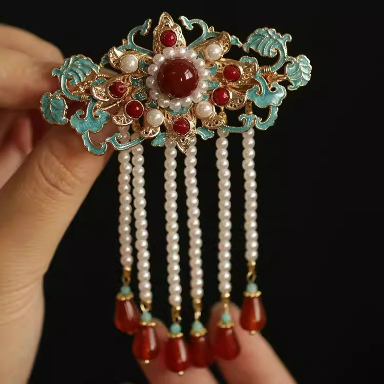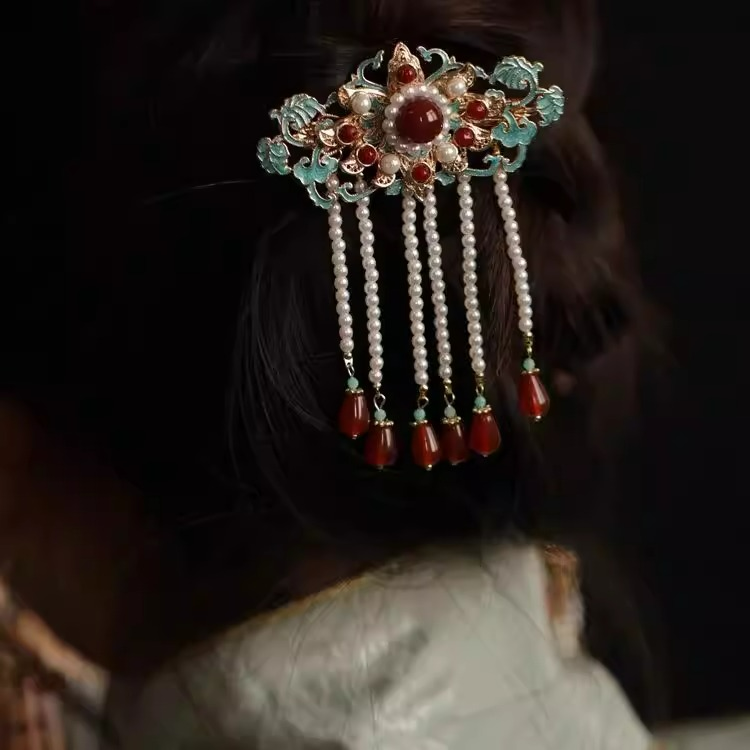 📚 古风汉服后压头饰复古宋制明制烧蓝流苏后压簪夹红色压鬓马面裙