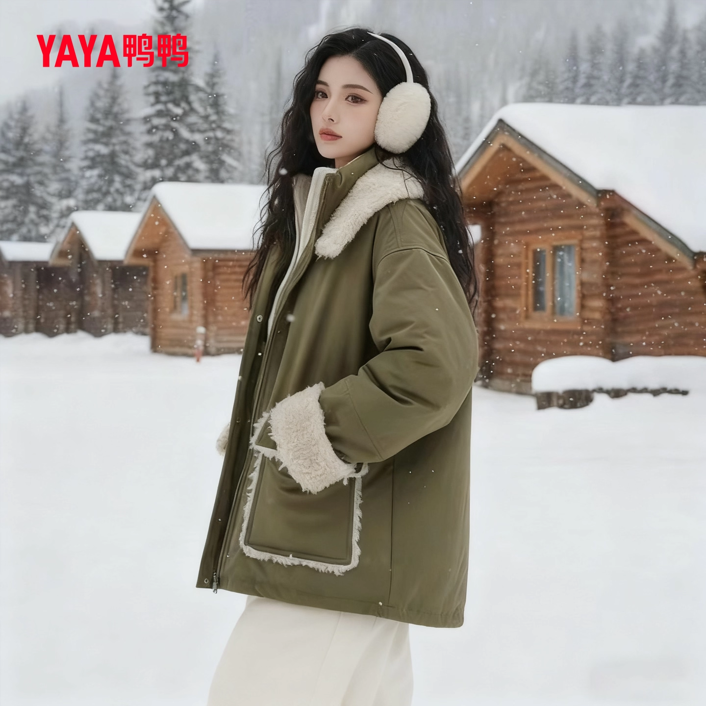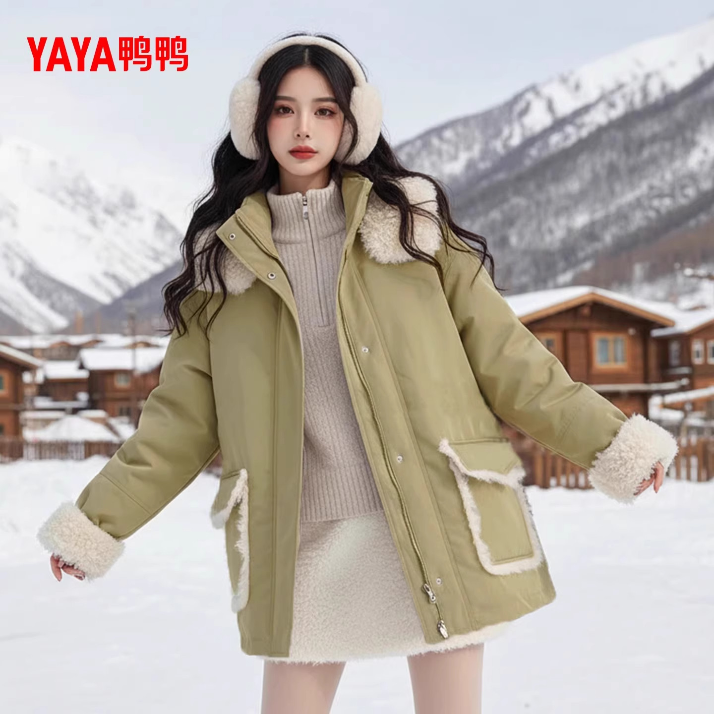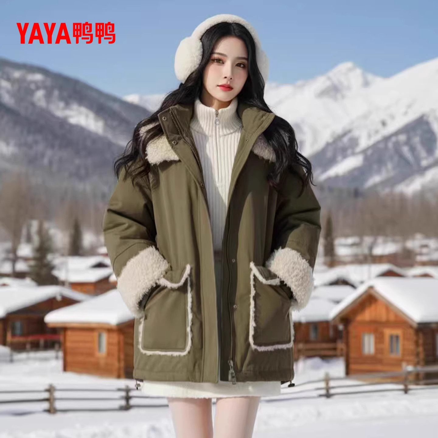 📚 鞠婧祎同款鸭鸭学院风羽绒服女冬季超流行羊羔毛拼接短款连帽外套