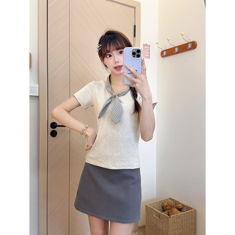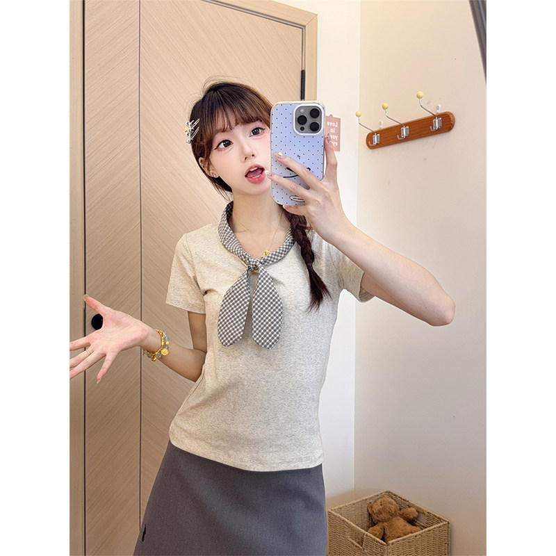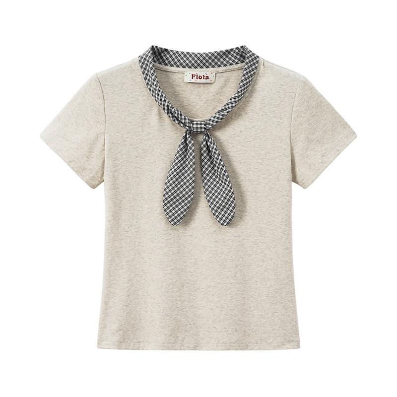 📚 【flota】韩系格纹兔耳朵领带短袖T恤夏季学院风减龄短款上衣1966