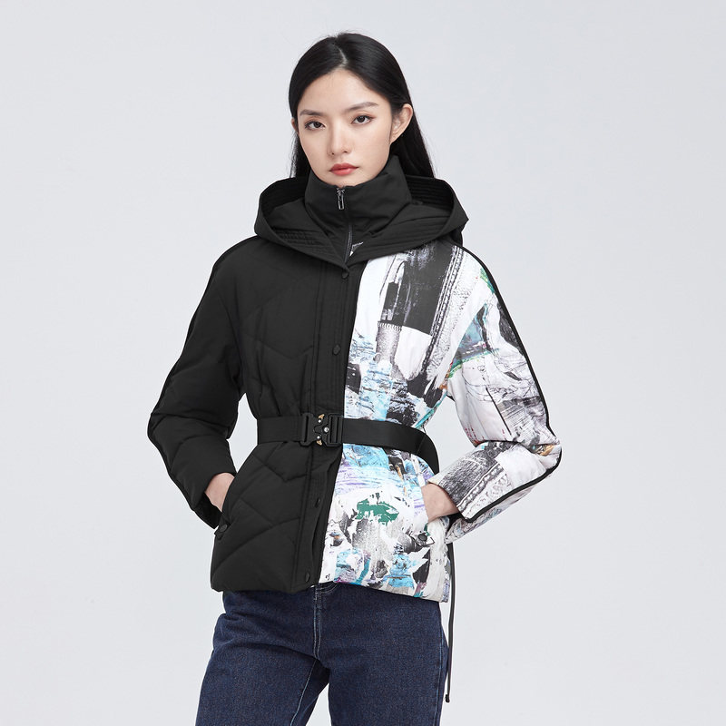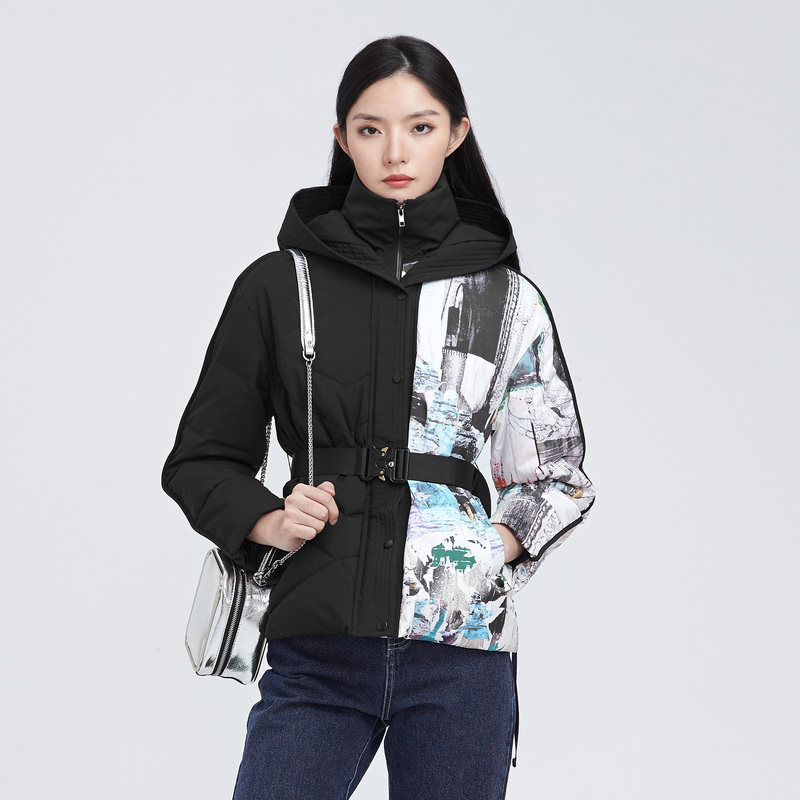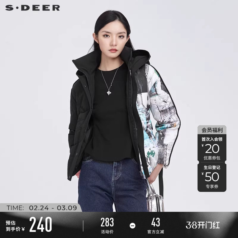 📚 sdeer圣迪奥冬季女装高领连帽字母涂鸦收腰中长款羽绒服S21482457