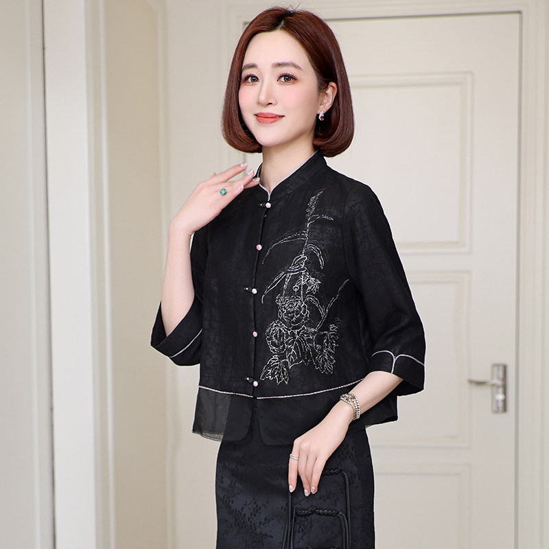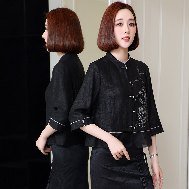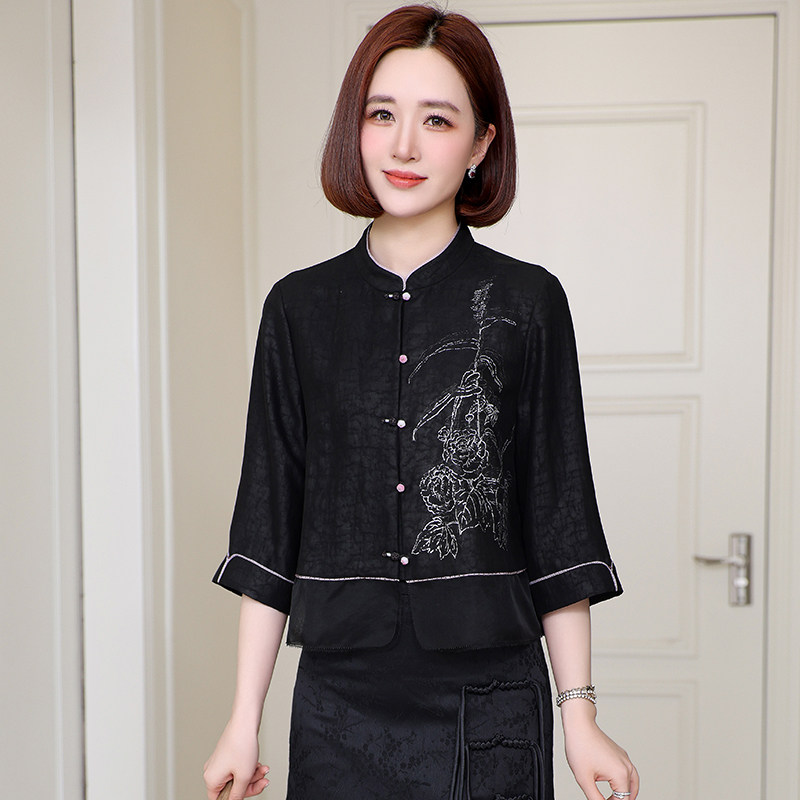 📚 新中式国风龟纹香云纱上衣2025夏高端品牌真丝衬衫女七分袖妈妈装