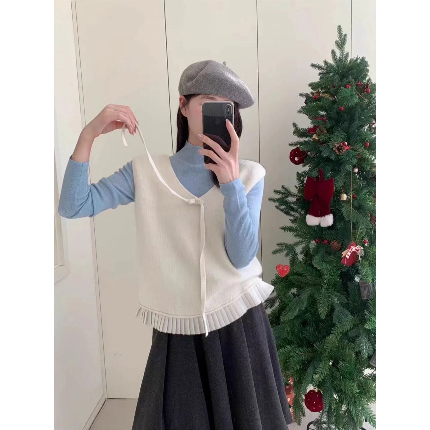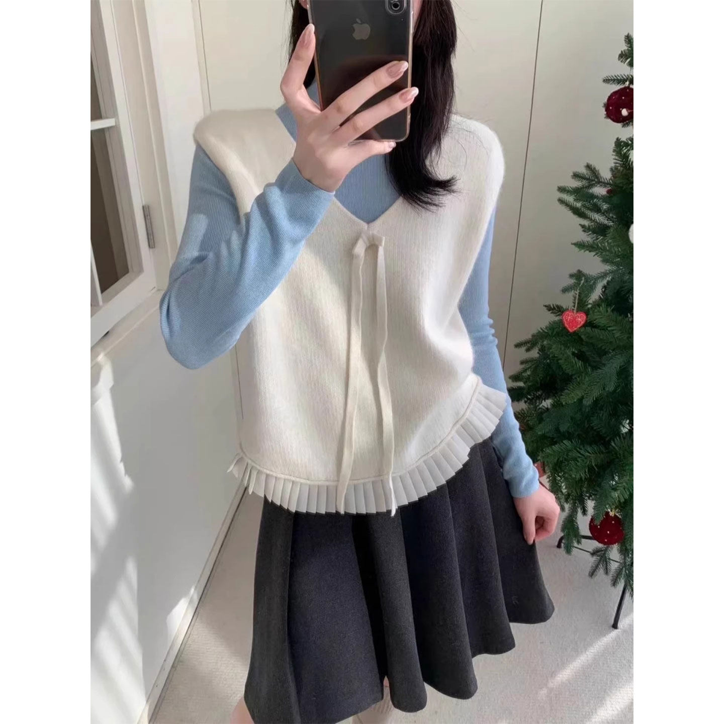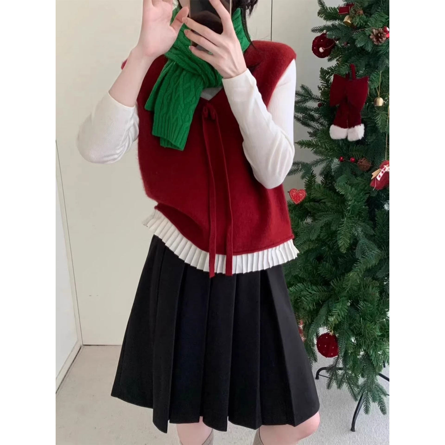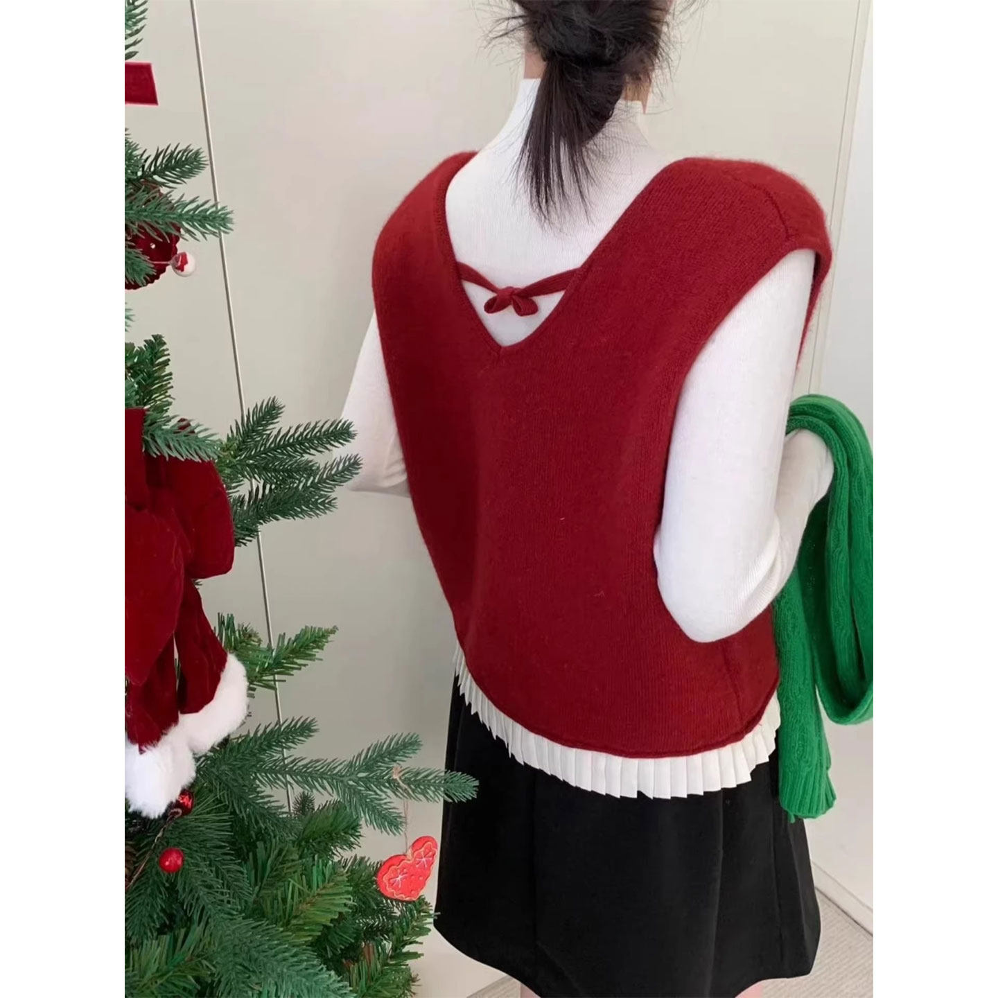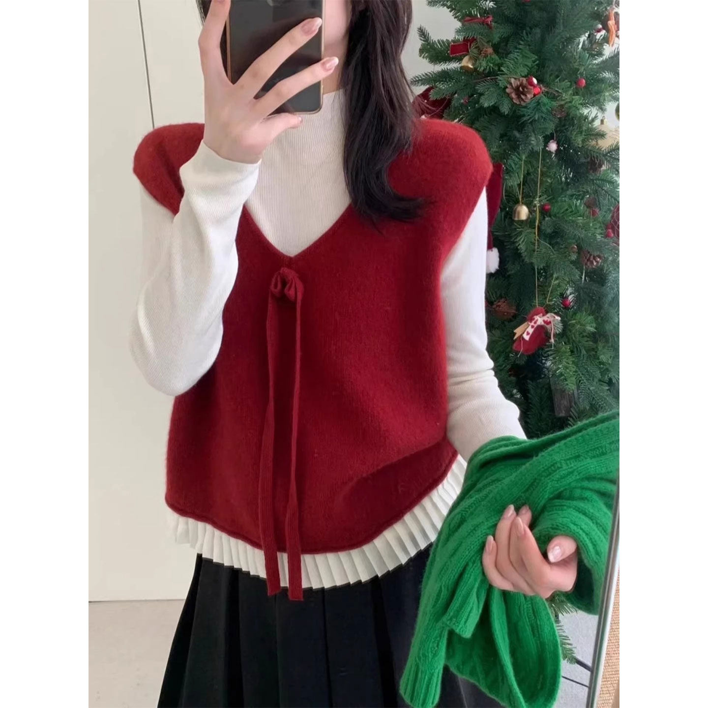 📚 红色V领系带针织马甲女26春秋冬叠穿减龄蝴蝶结无袖坎肩背心上衣