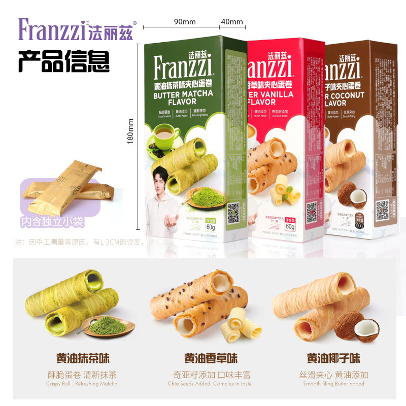 📚 法丽兹夹心黄油蛋卷60g抹茶香草椰子味蛋酥脆脆卷休闲零食下午茶