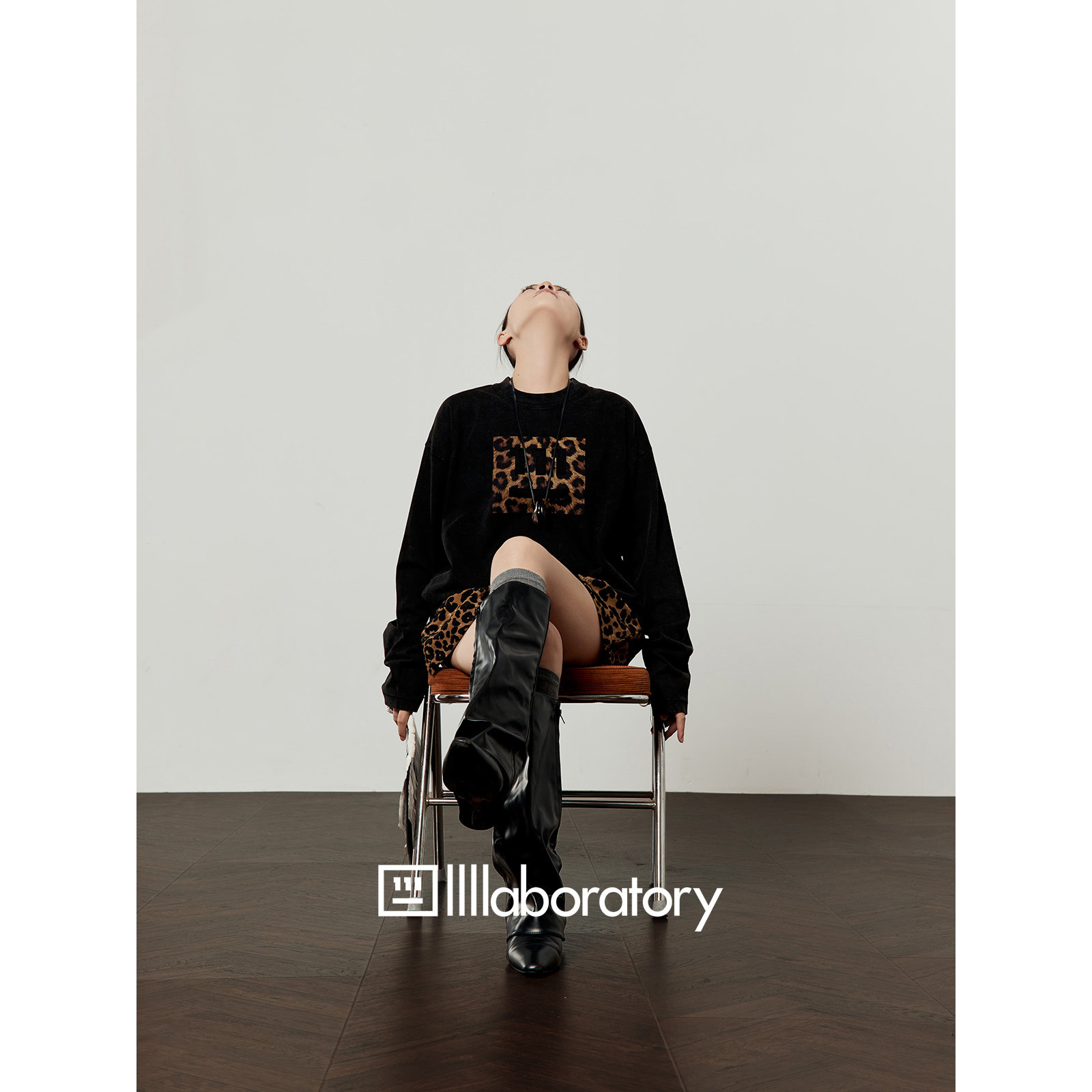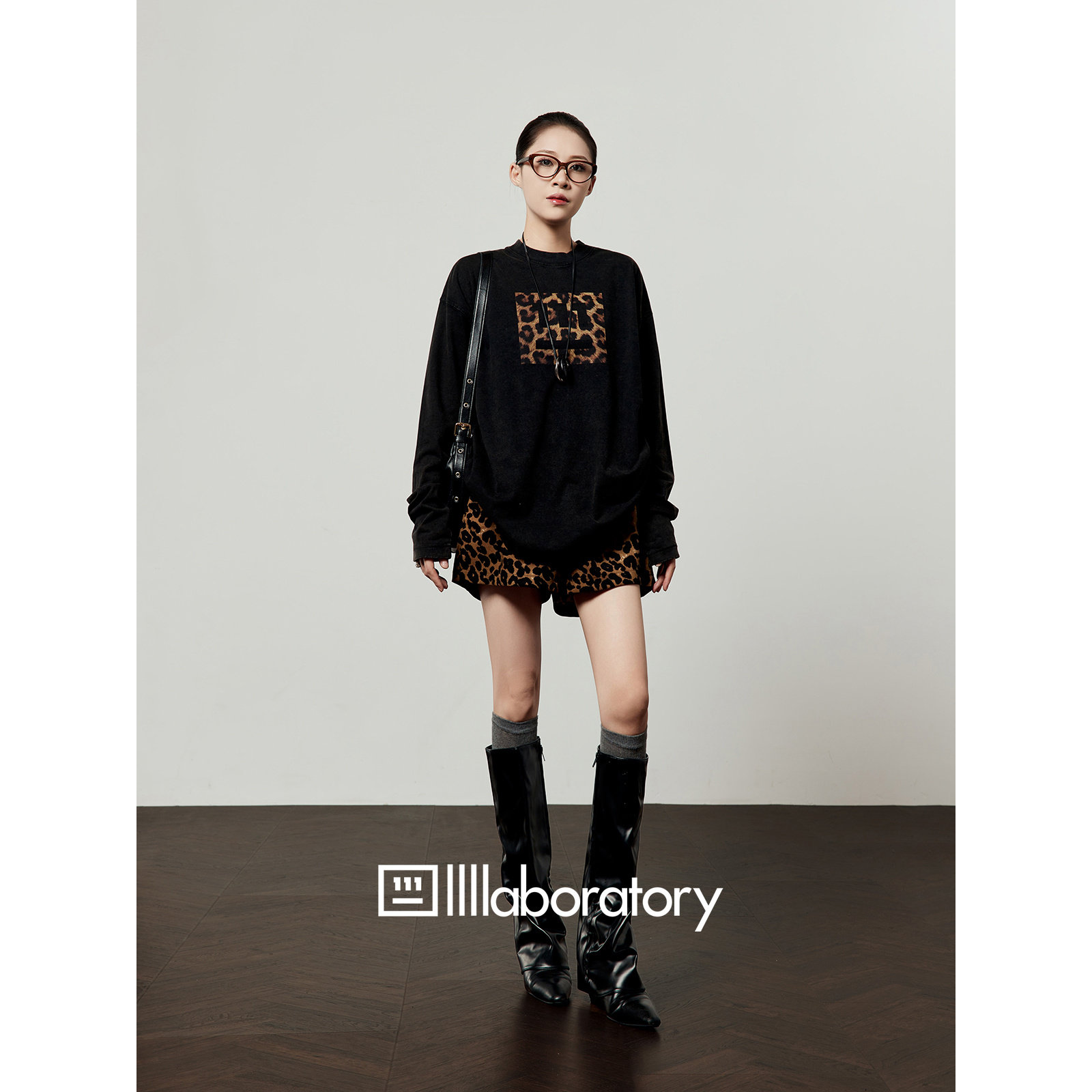 📚 「周里物出品」黑色T恤女2025秋季新款豹纹周里物印花宽松感长袖
