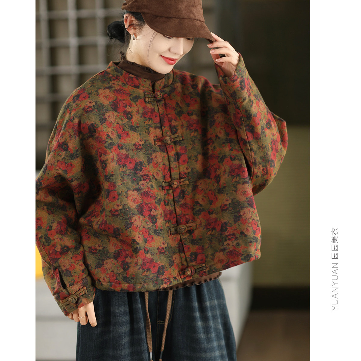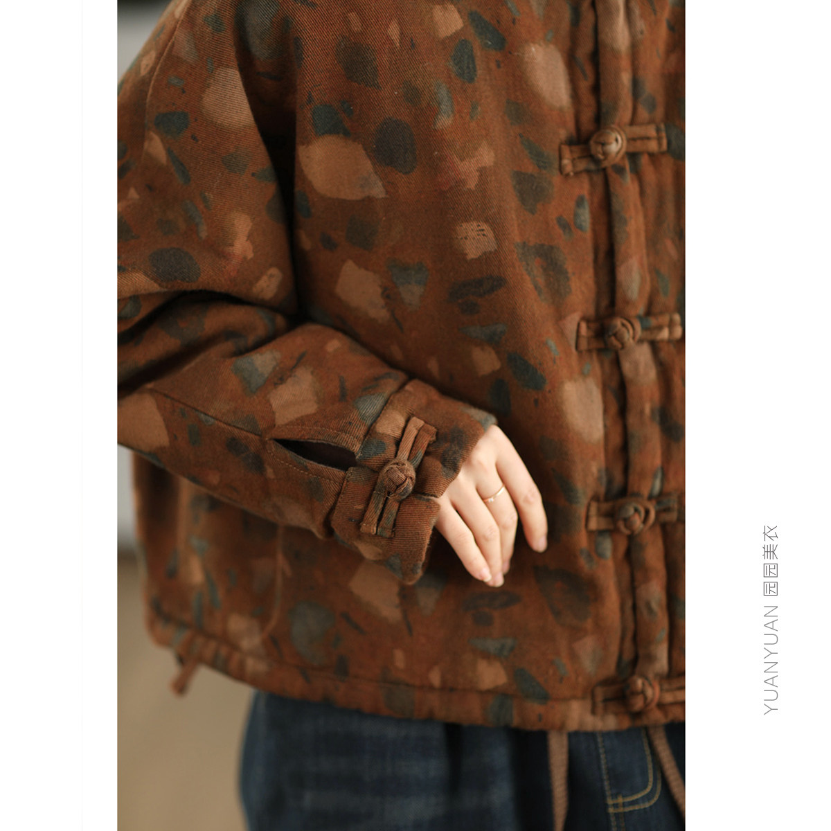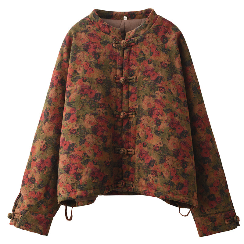 📚 复古炒色印花麻棉夹棉外套女冬季中式盘扣保暖棉袄国风文艺棉衣