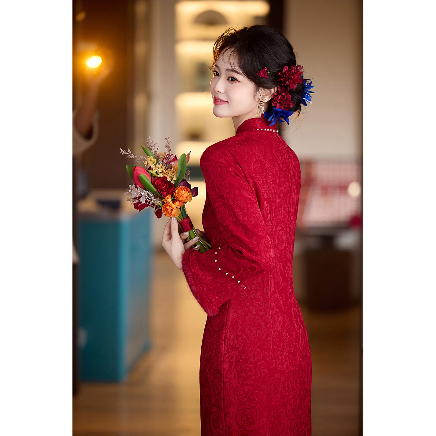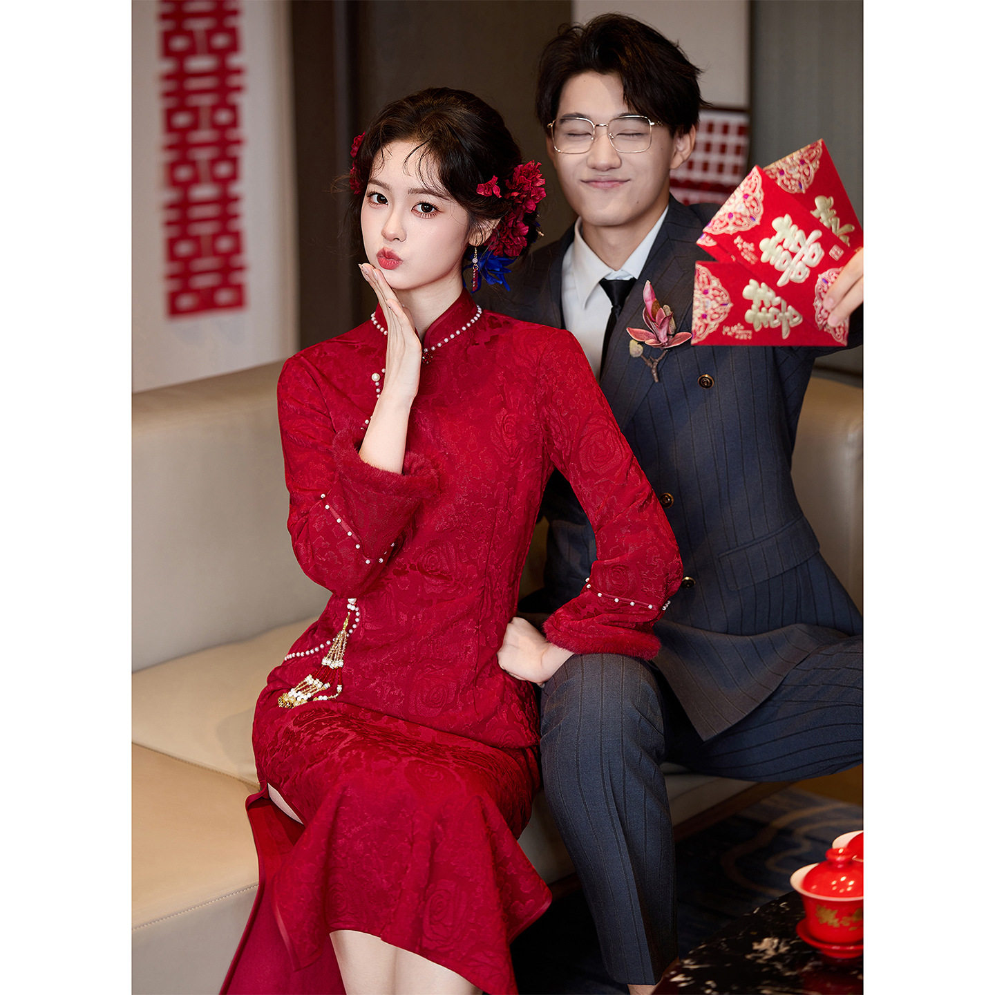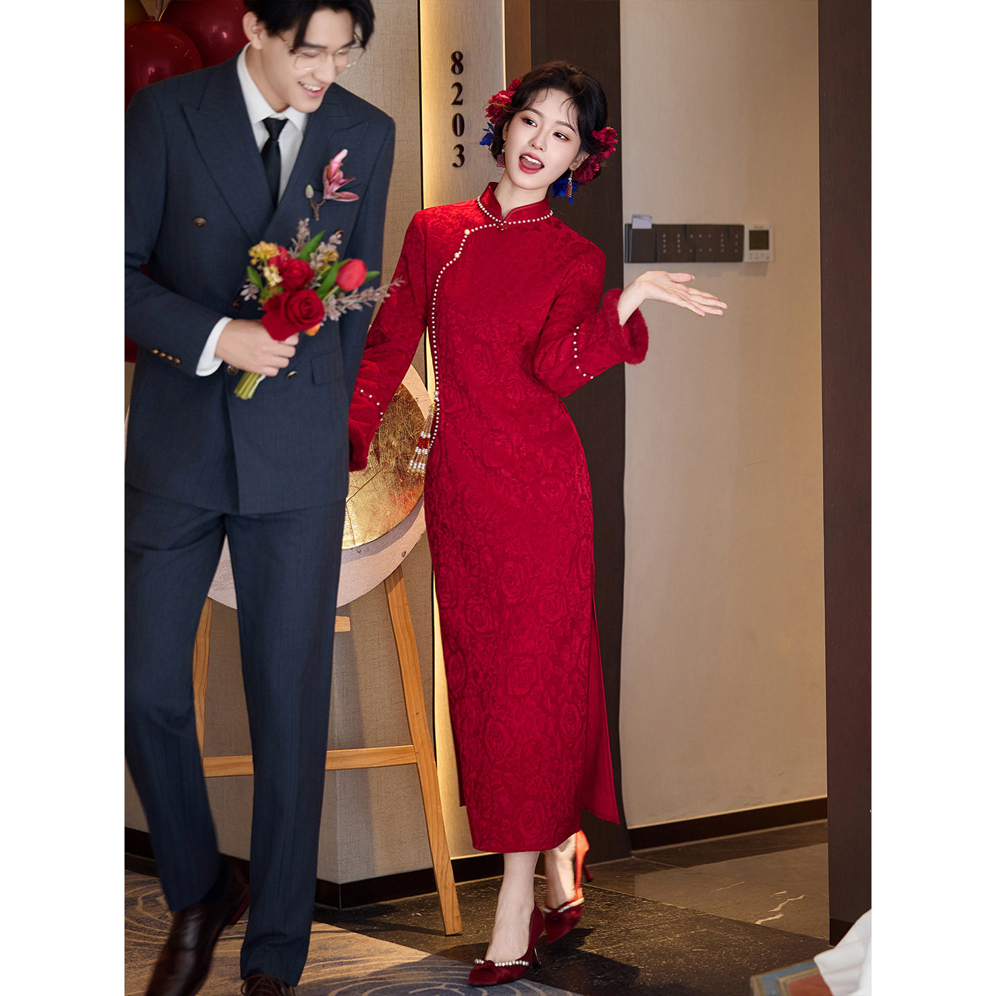 📚 红色旗袍敬酒服新娘冬装订婚结婚礼服新中式婚礼回门冬季加绒加厚