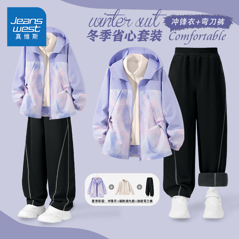 📚 真维斯童装女童春装套装儿童秋冬款户外冲锋衣女孩春秋加绒弯刀裤