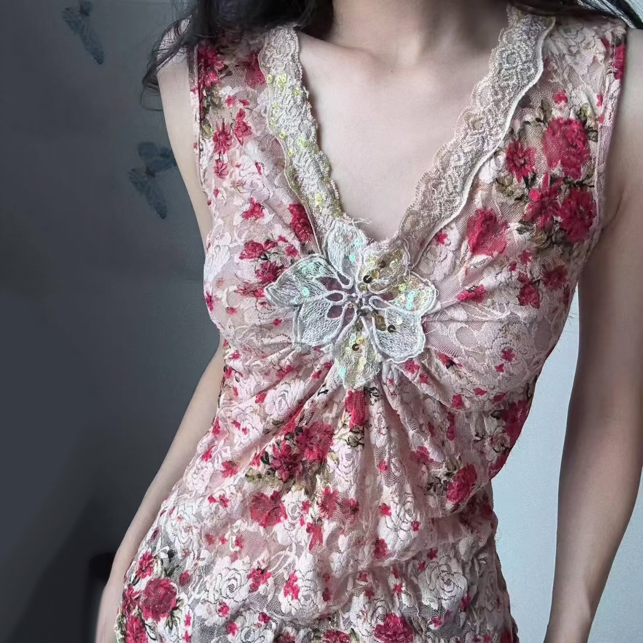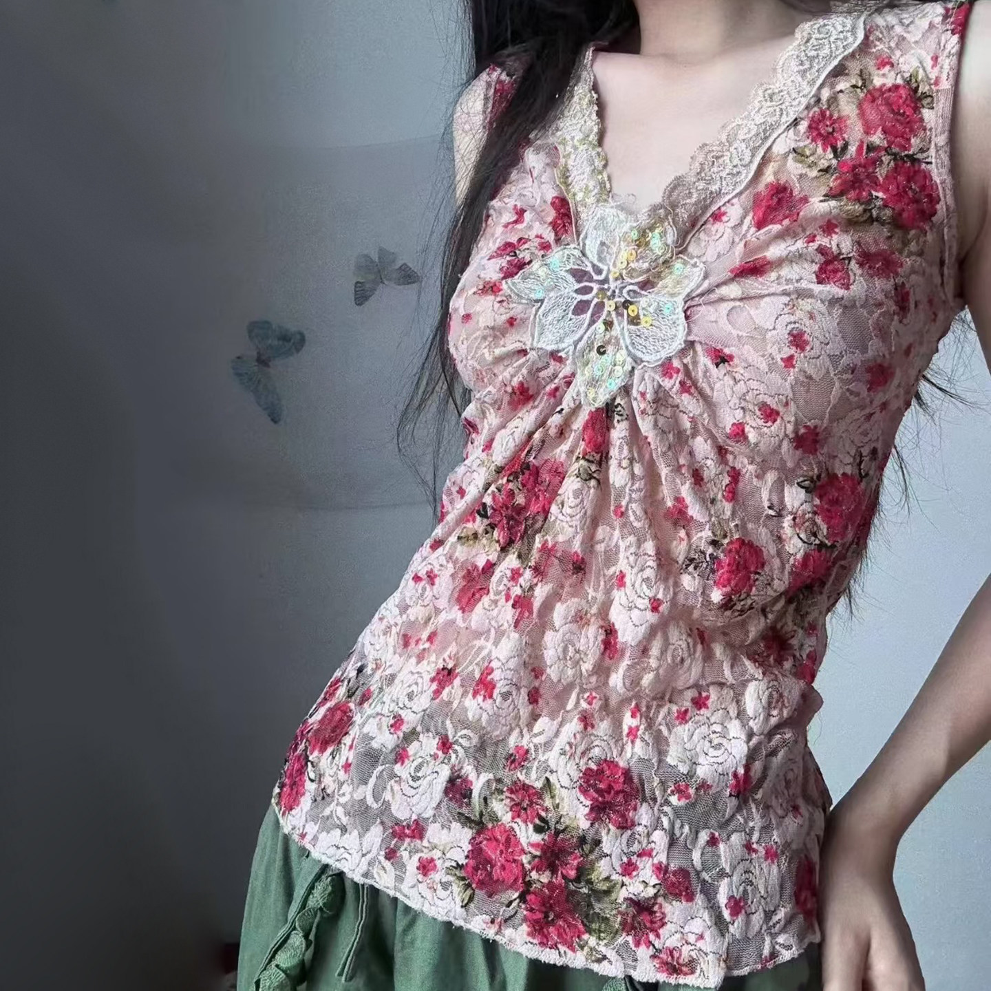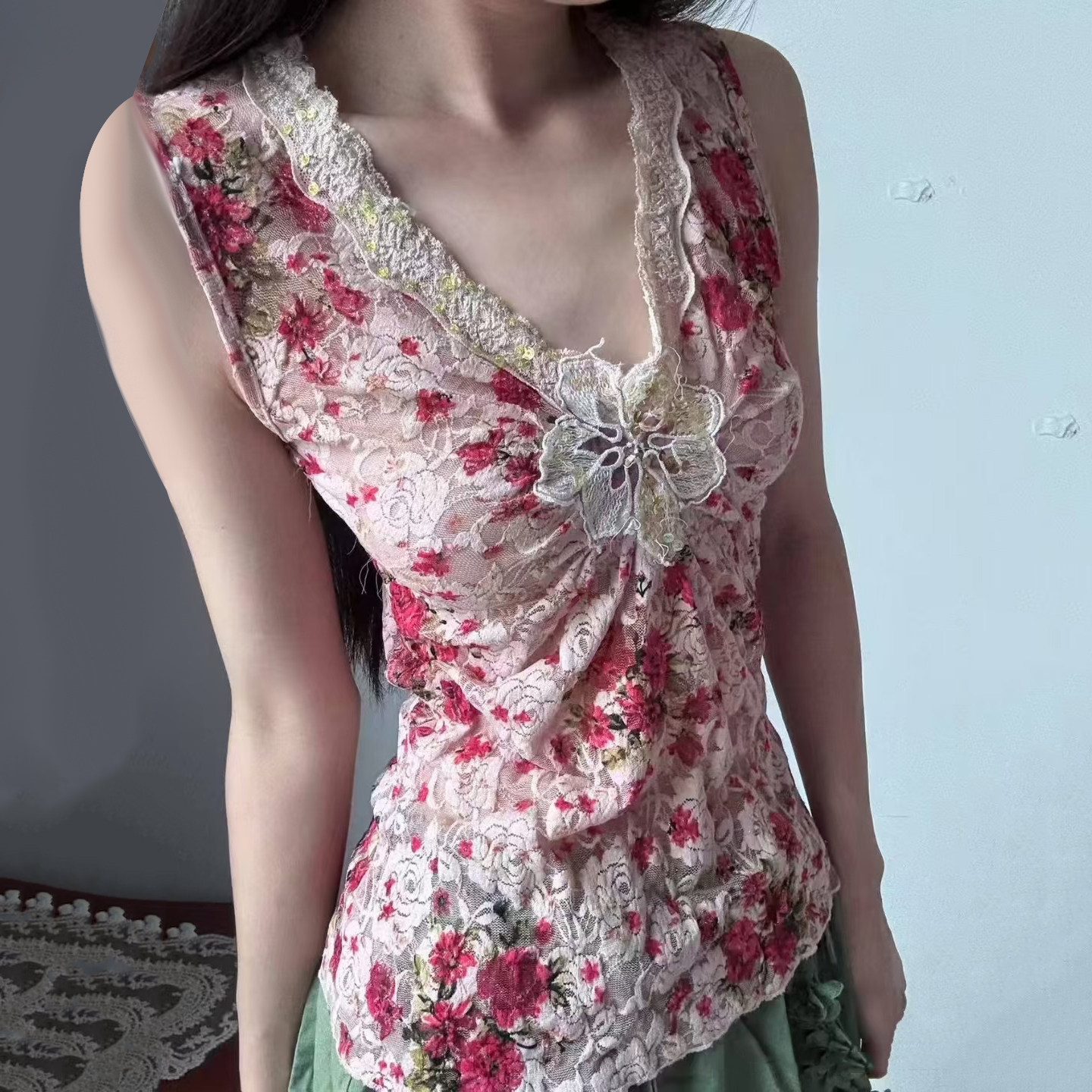 📚 eilove古着辣妹重工蕾丝深v领背心女夏日繁花vintage外穿无袖上衣