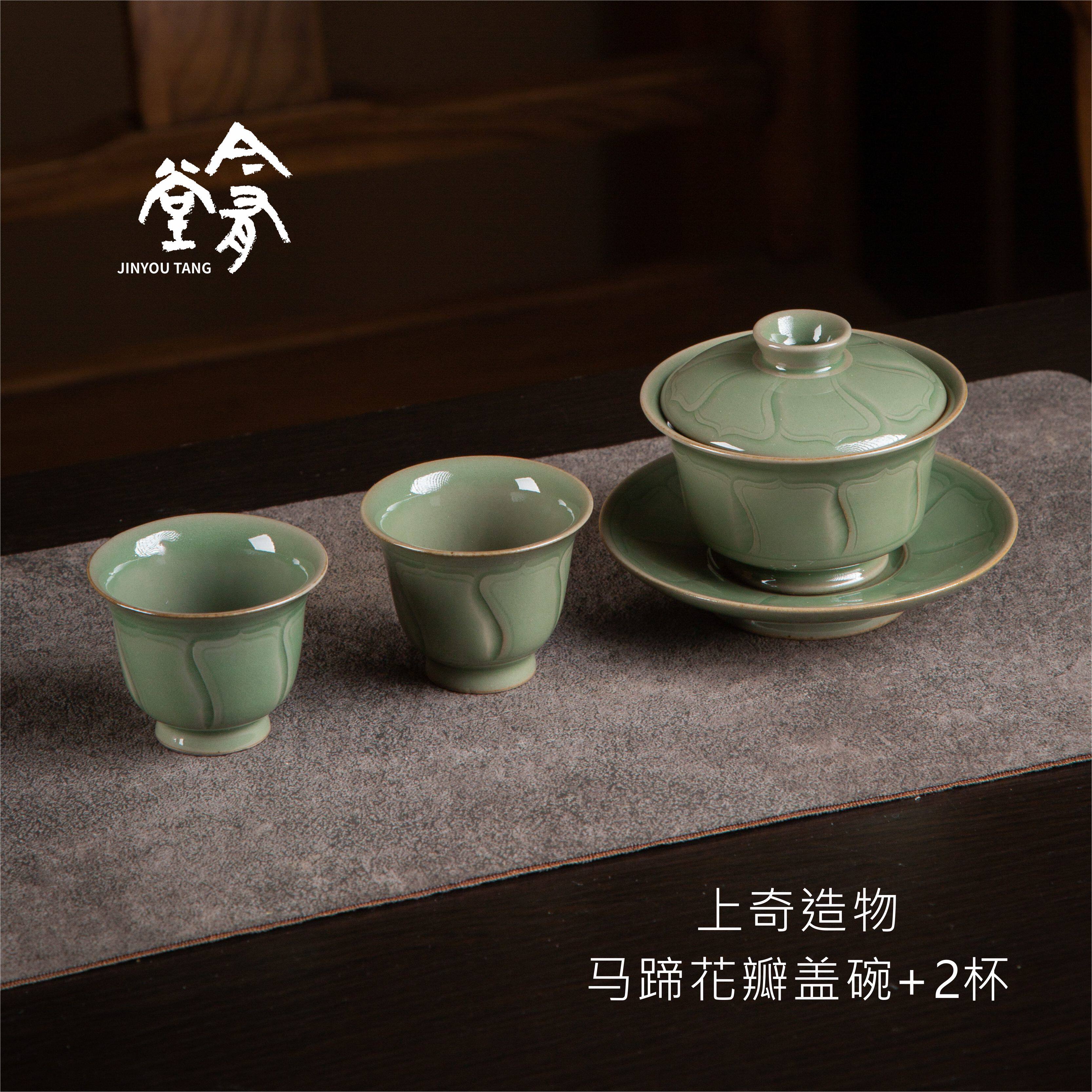 📚 上奇造物|耀州窑马蹄花瓣宽莲瓣纹三才盖碗两杯套组礼盒套装茶具