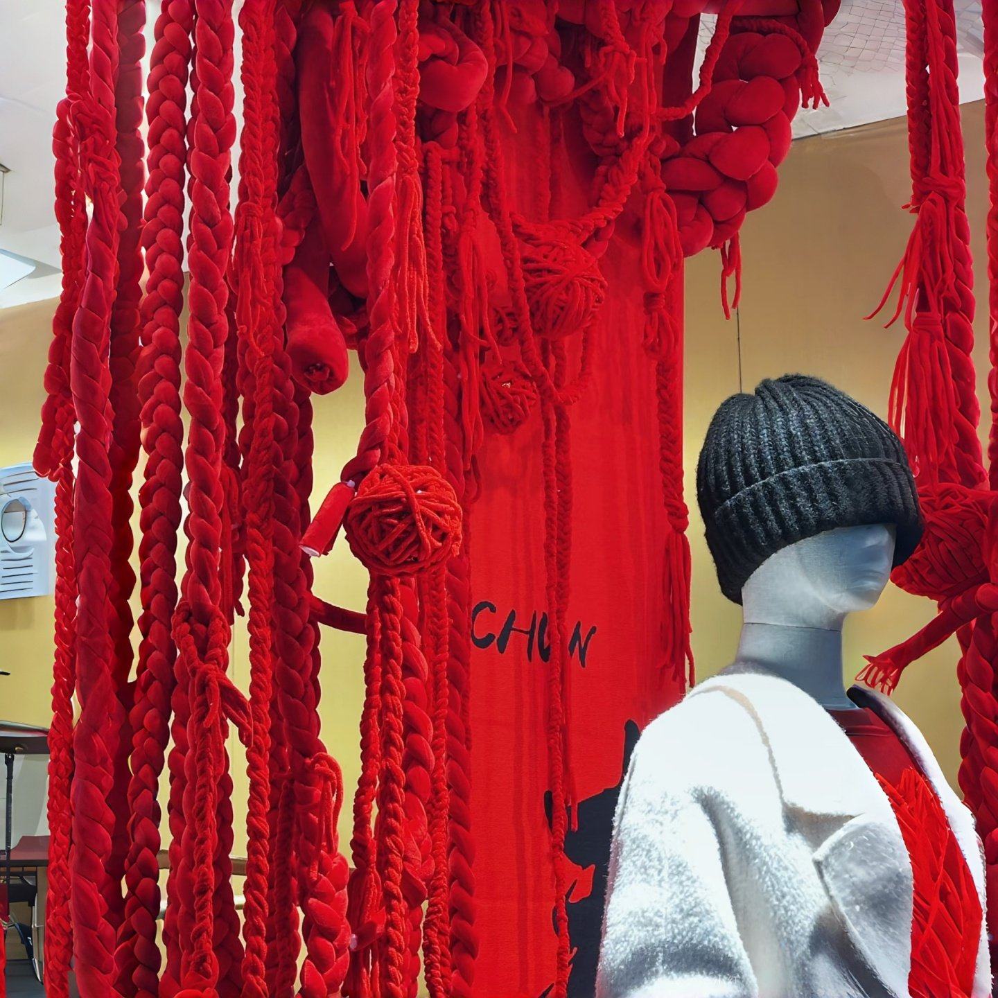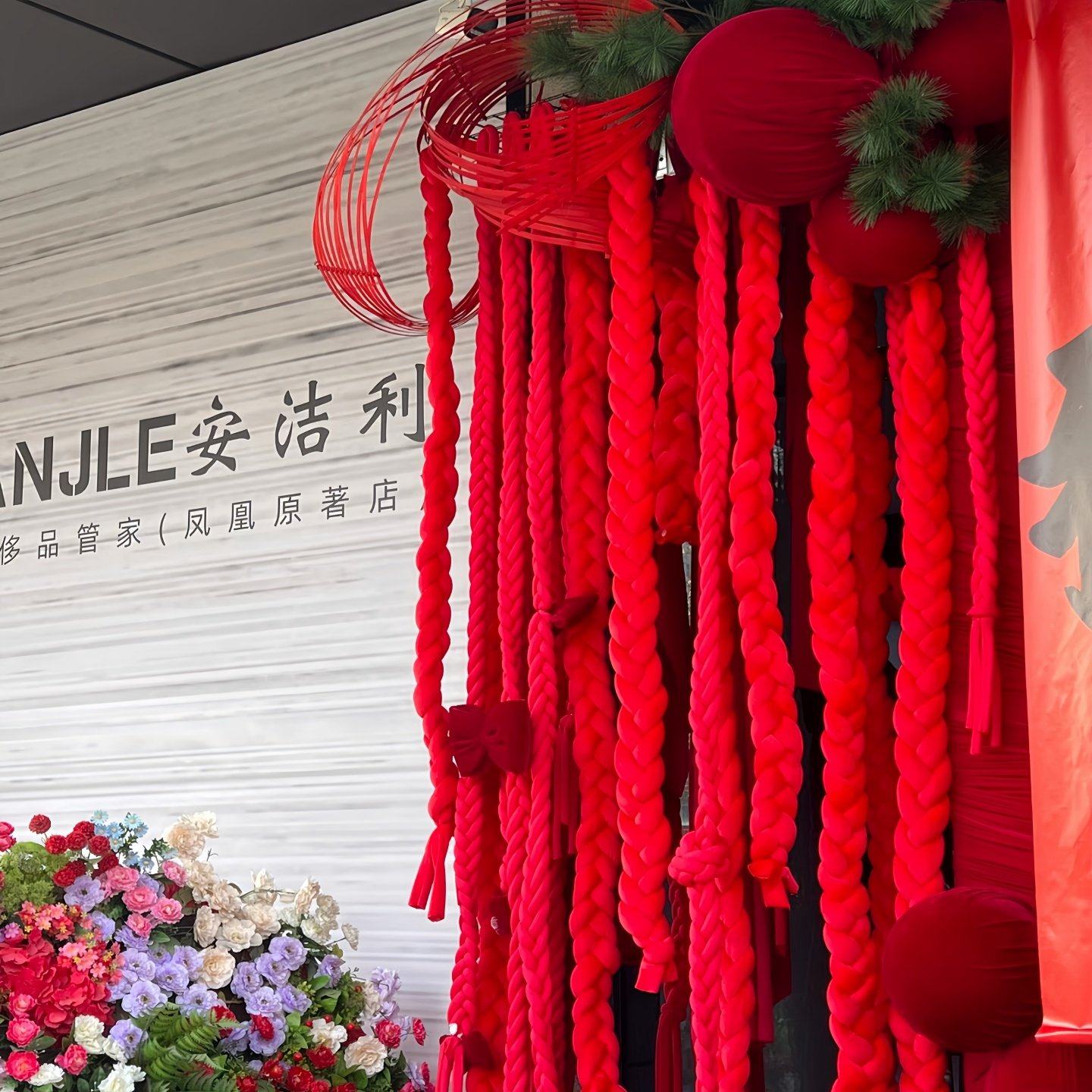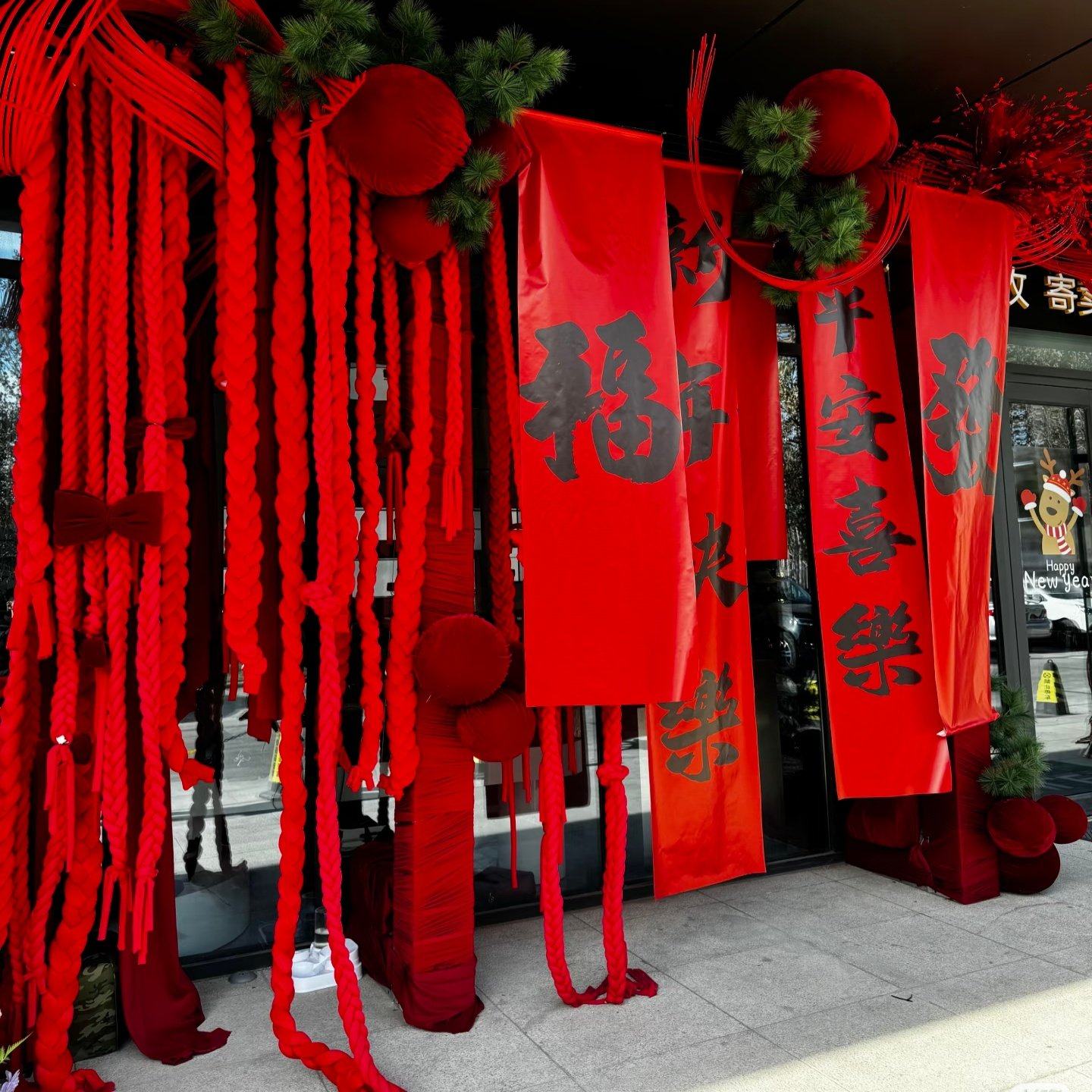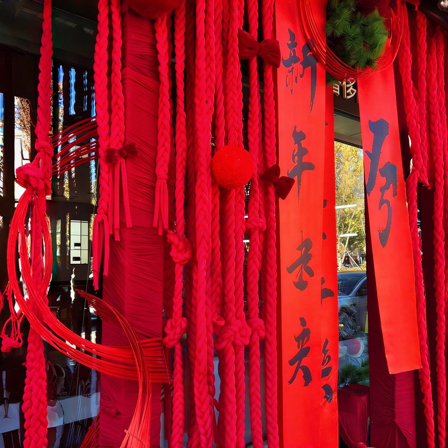 📚 新年商场橱窗美陈装饰元旦店铺门头挂饰红色冰岛毛线麻绳麻花辫