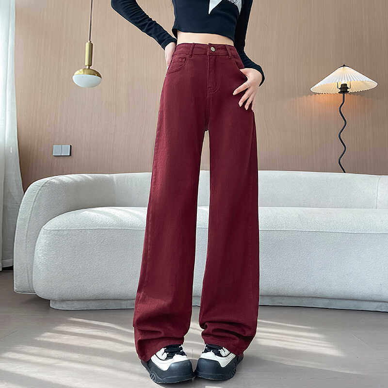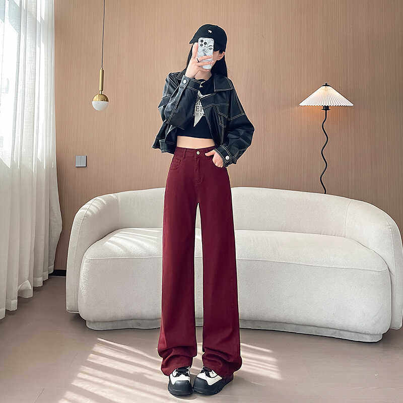 📚 加长裤子女酒红色高腰牛仔直筒裤春秋2025新款窄版安可拉红阔腿裤