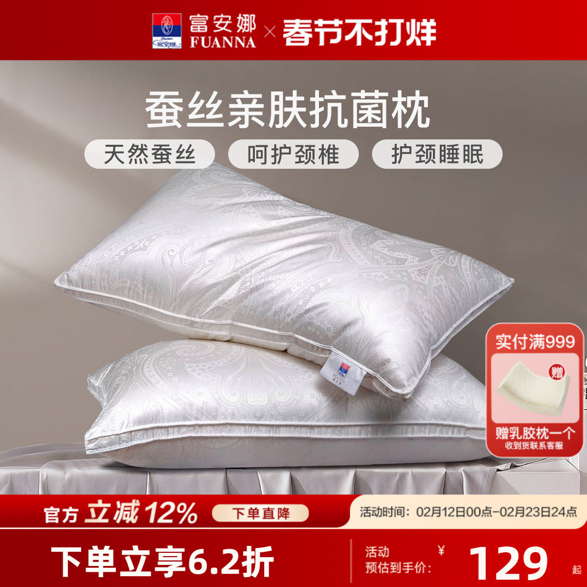 📚 富安娜枕头蚕丝枕轻奢提花成人家用睡眠护颈酒店丝棉学生单只枕芯
