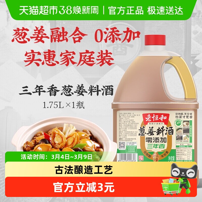 📚 老恒和零添加葱姜料酒纯谷物酿造黄酒1.75L一级品质去腥解膻调味