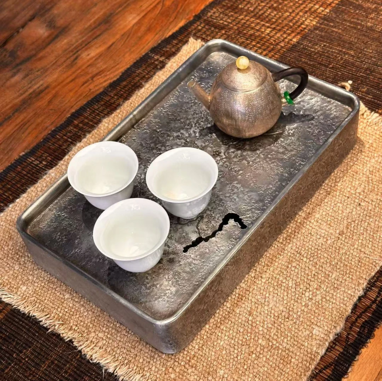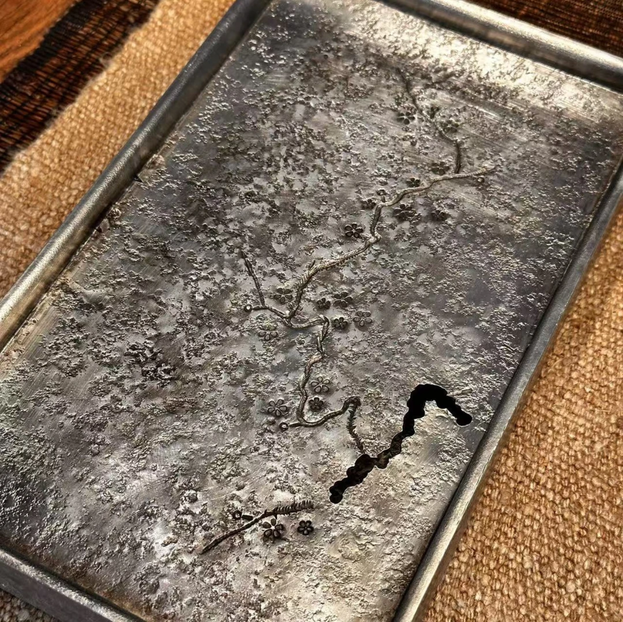 📚 纯手工纯锡制锤纹梅花纂刻大茶盘茶空间文人干泡台茶道配件壶承台