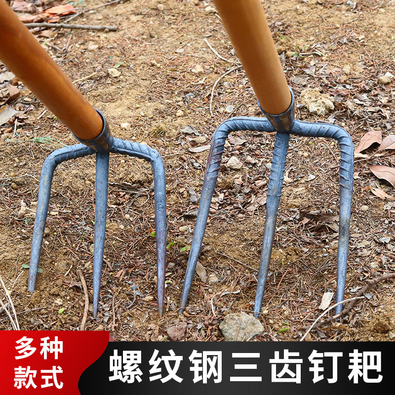 📚 三齿农用钉耙锰钢耙子铁耙开荒翻地多齿耙钉耙花园种菜翻土松土耙