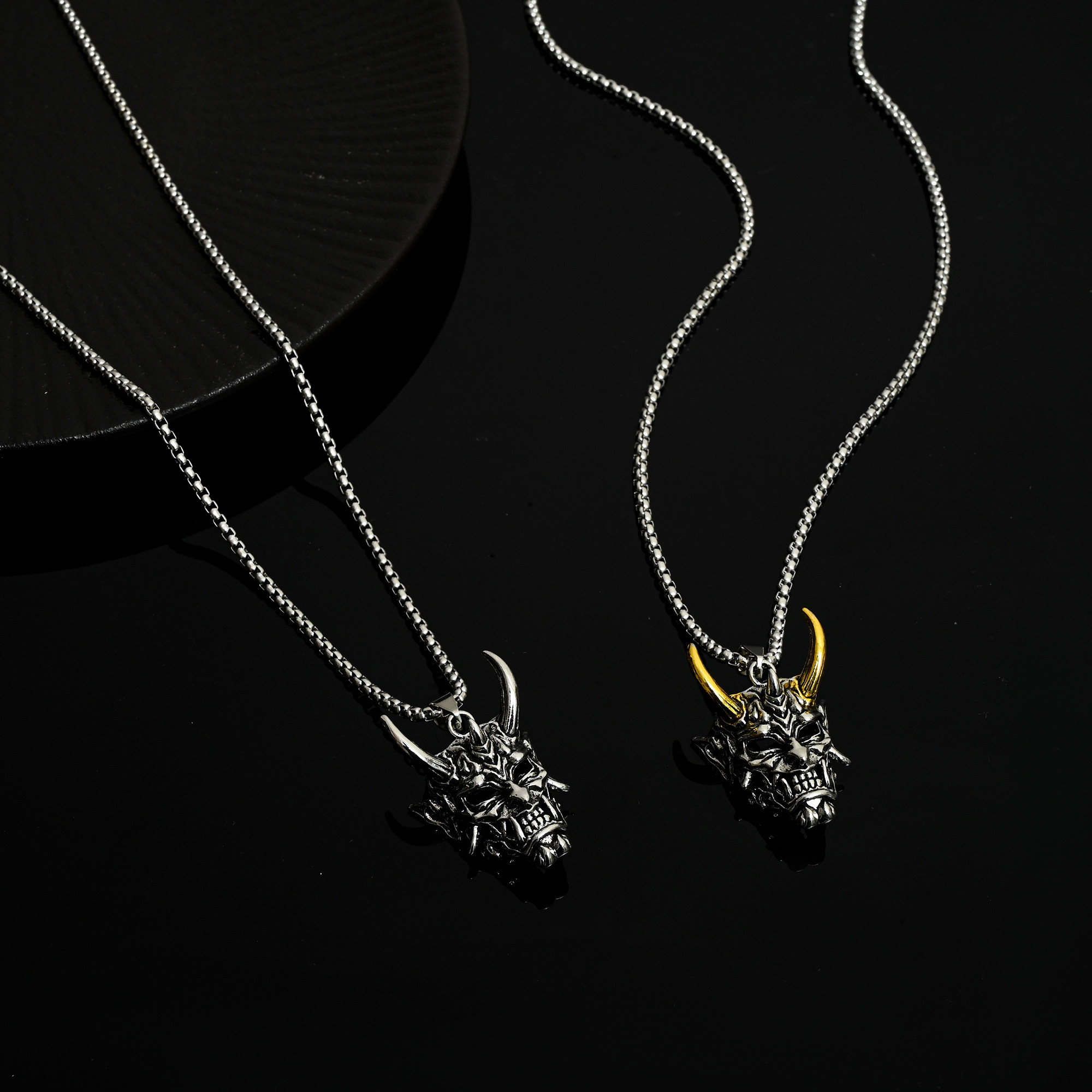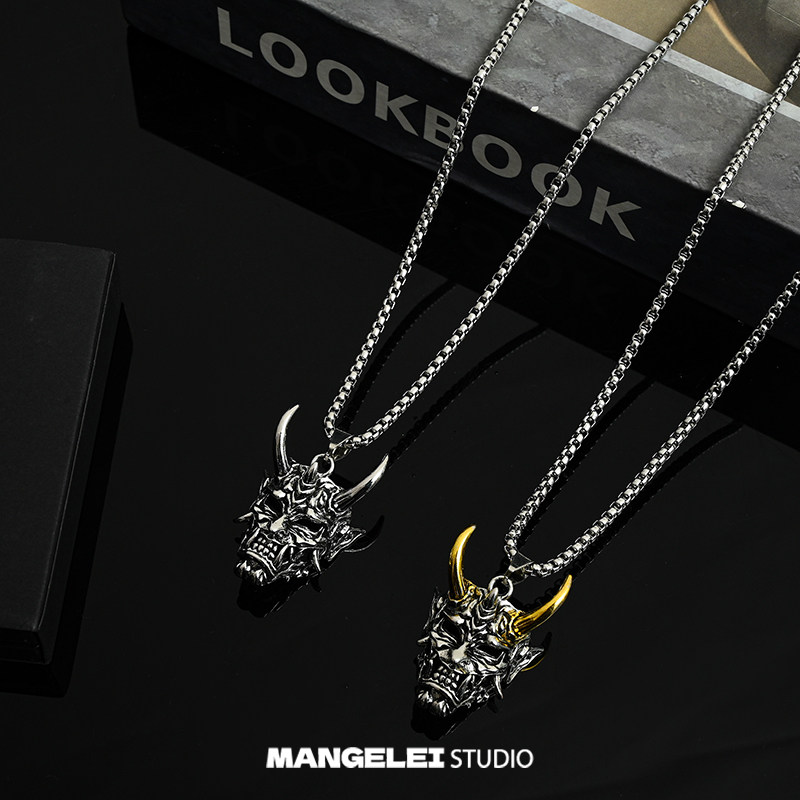 📚 般若金角钛钢项链男潮鬼怪骷髅面具个性嘻哈潮男街头毛衣链吊坠