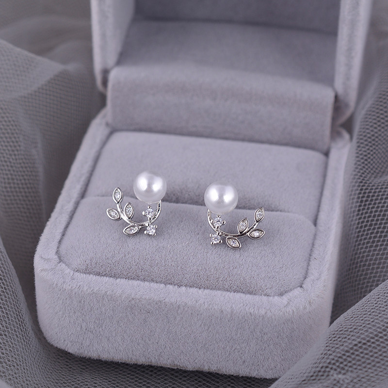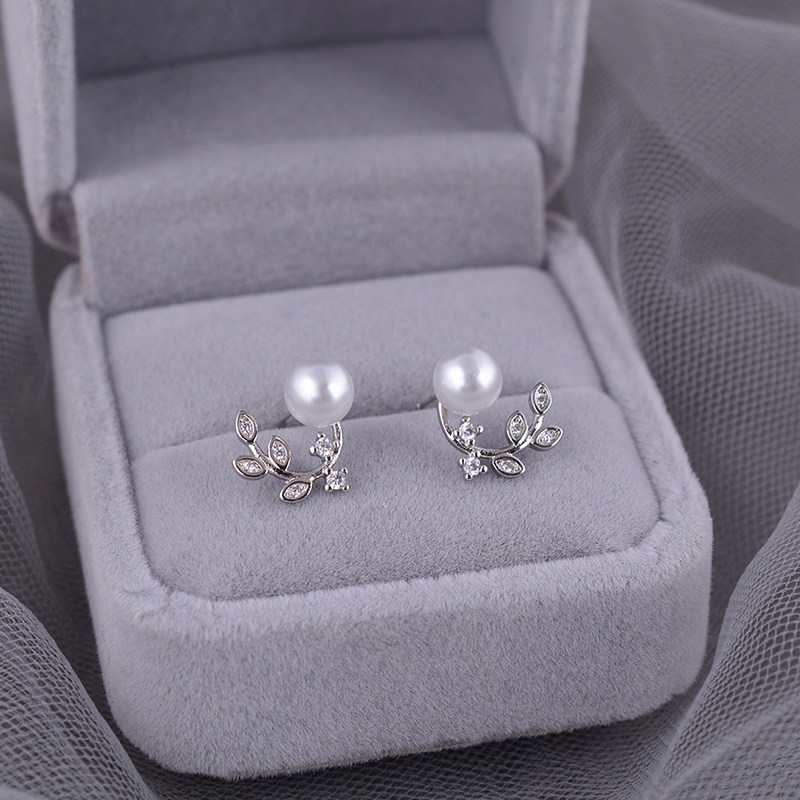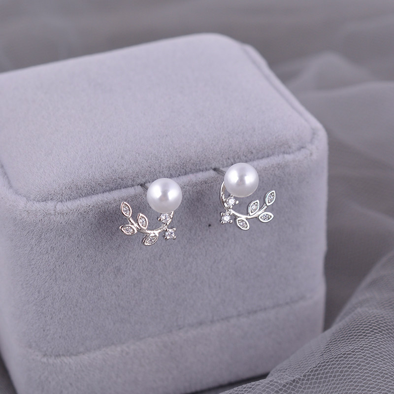 📚 925纯银文艺清新镶钻树叶耳钉韩国气质珍珠女耳环高级轻奢耳饰ins