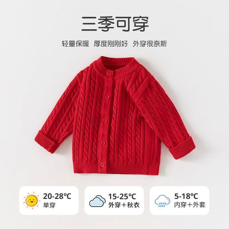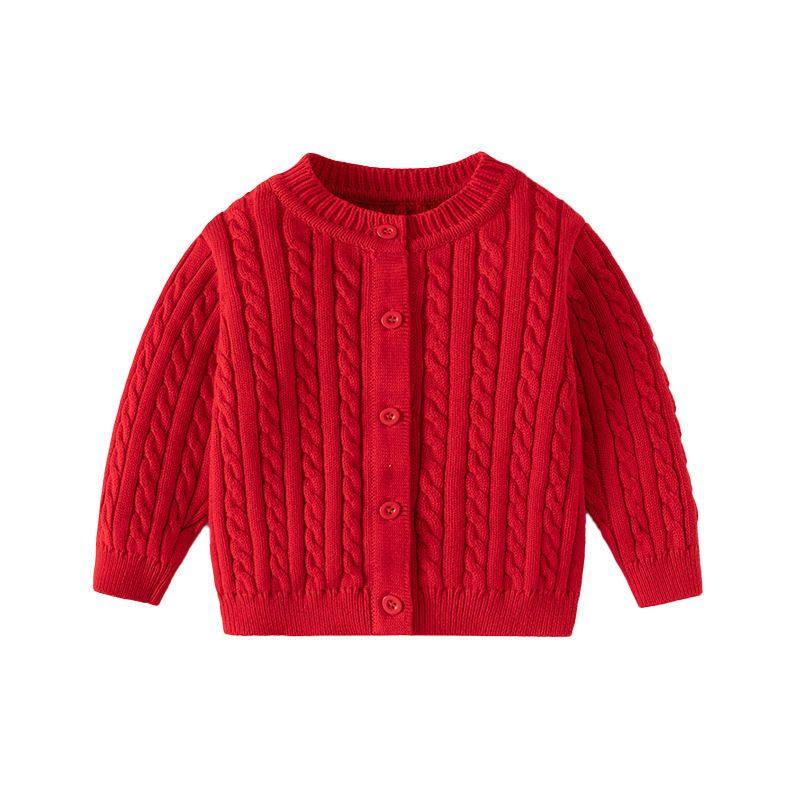 📚 婴儿红色毛衣秋冬新款中小女童宝宝a类纯棉加厚麻花针织扣子开衫