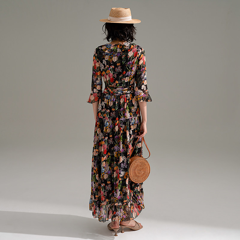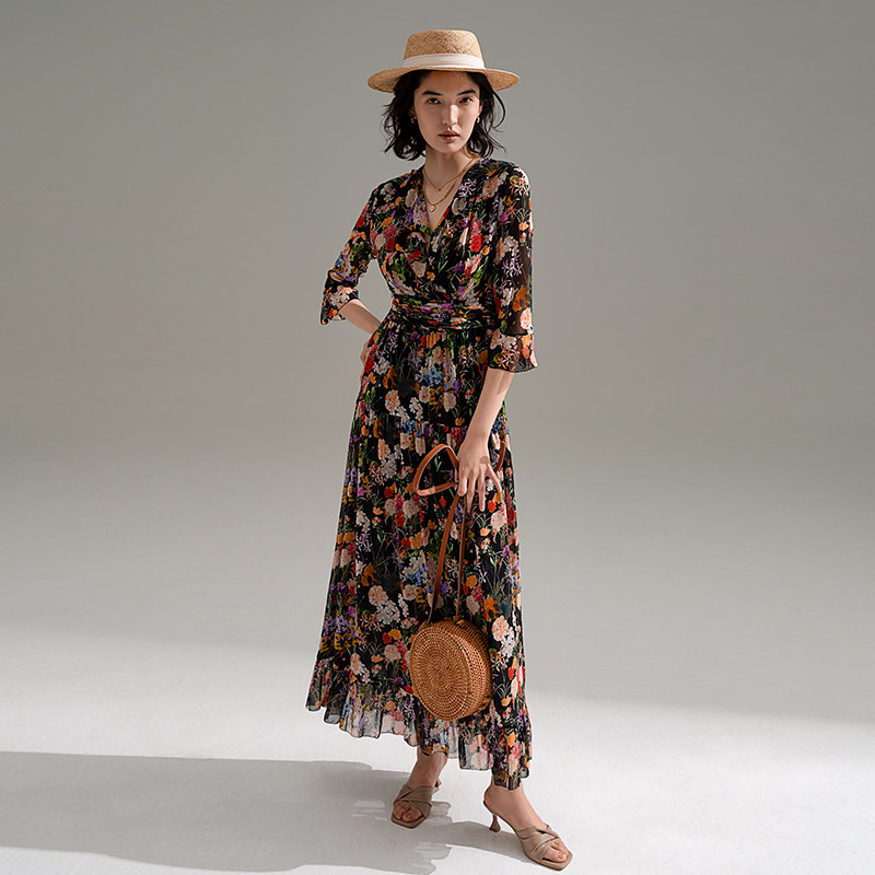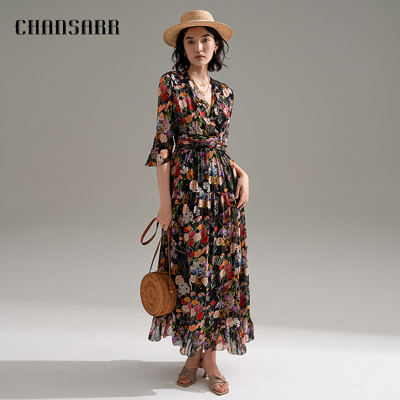 📚 香莎CHANSARR 扶桑花真丝连衣裙 法式时尚长裙修身