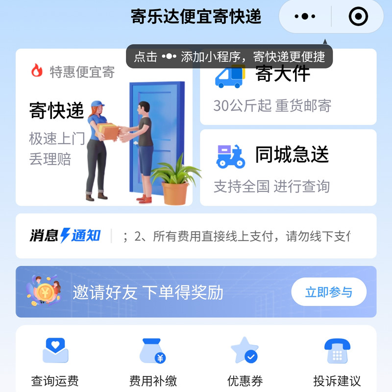 总的来说,寄乐达便宜寄快递小程序真的是一个非常不错的快递服务选择。它不仅提供了便捷的快递服务,还有各种优惠活动。如果你正在寻找一个省心、省力的快递服务,那么这个小程序绝对是你的不二之选!