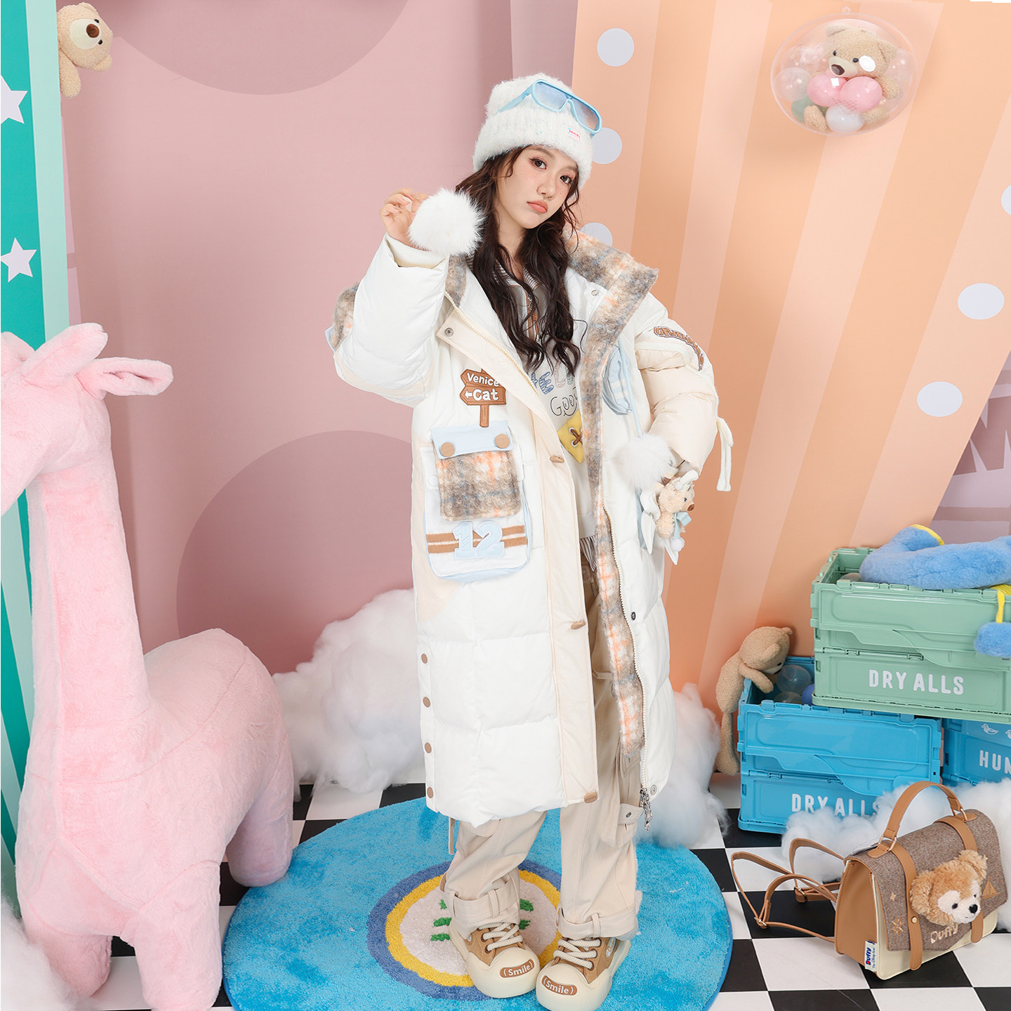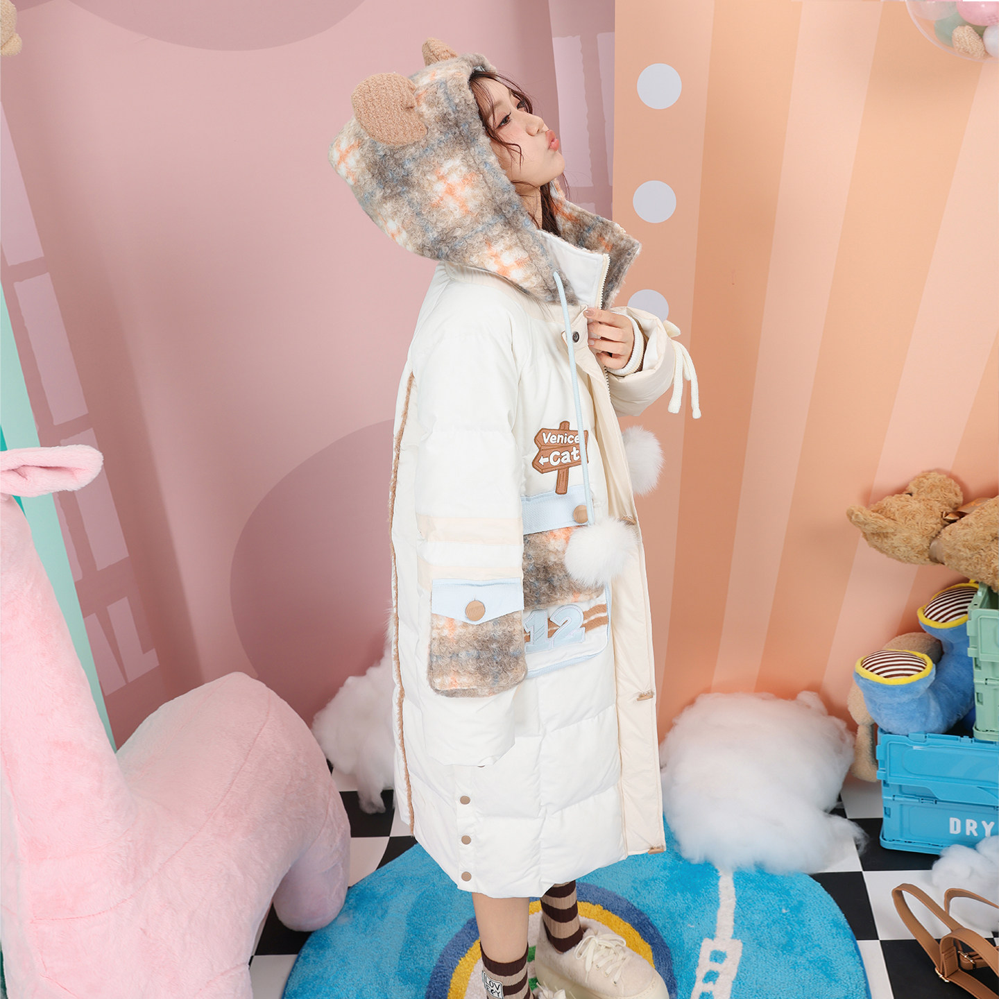 📚 冬学院多口袋蝴蝶结熊耳朵格子毛呢连帽90白鸭绒中长款白色羽绒服